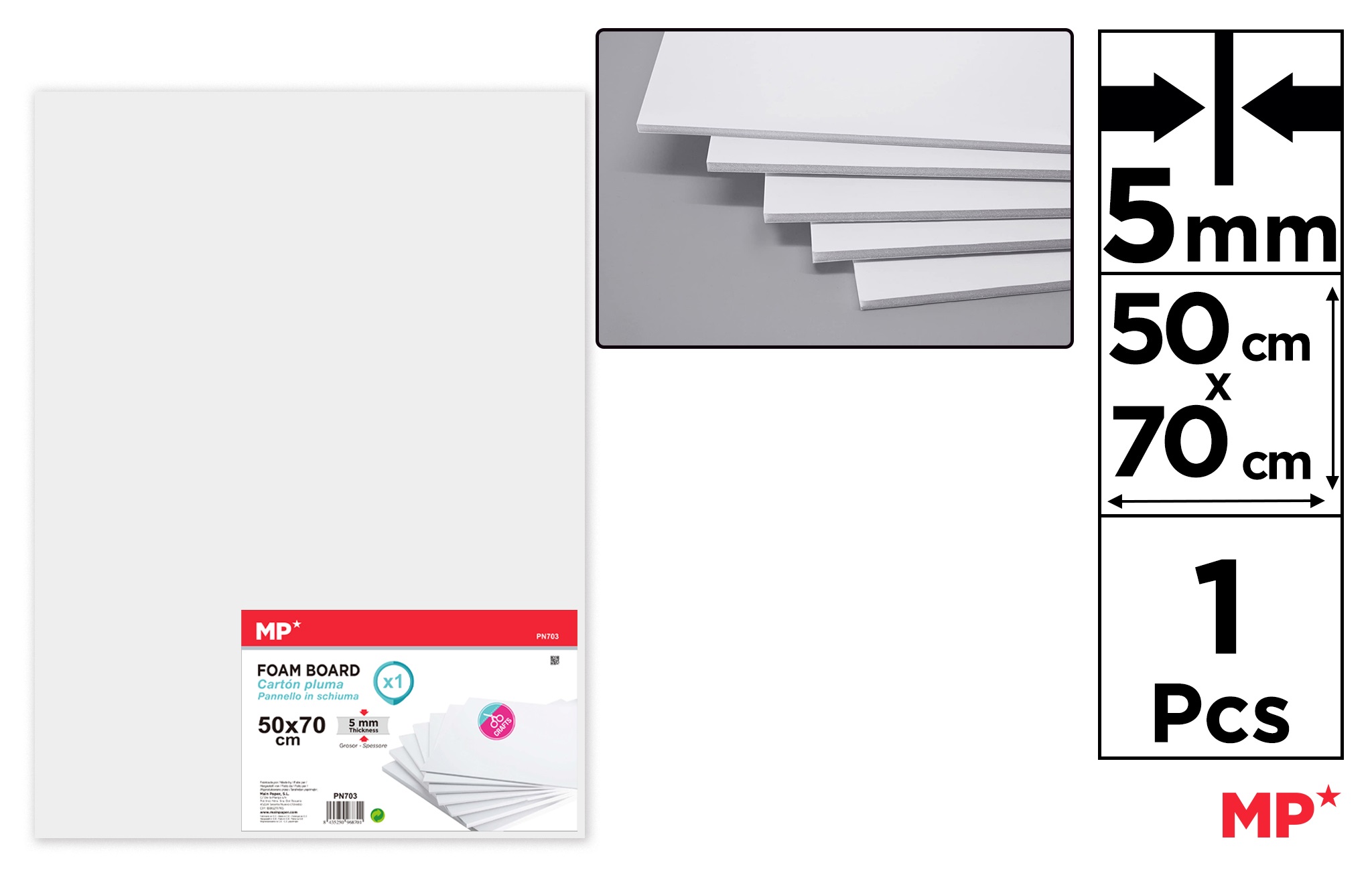 Foam board made of light polyurethane foam withtwosides of cardboard. Great rigidity and verylight.Perfect for mockups and as a support forimages.You can cut, paste and click on it.Thickness:5 mm. Measurements: 500 x 700 mm. Whitecolour.