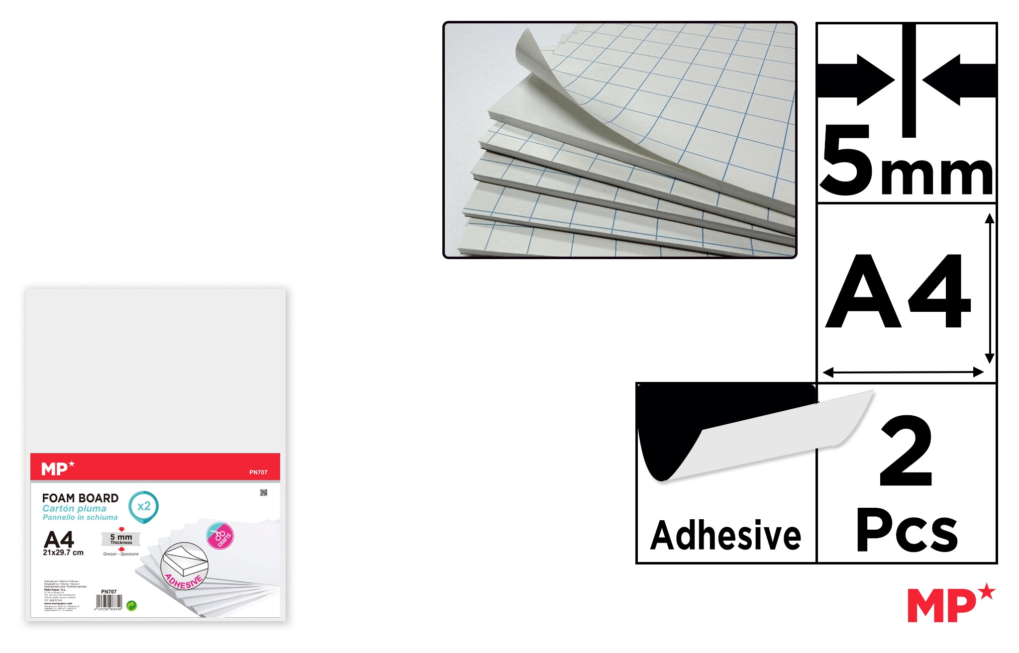 Adhesive foam board made of light polyurethanefoamwith two sides of cardboard. One side isadhesive.Great rigidity and very light. Perfectformockups and as a support for images. You cancut,paste and click on it. Thickness: 5 mm. A4size.Measurements: 210 x 297 mm. White colour.