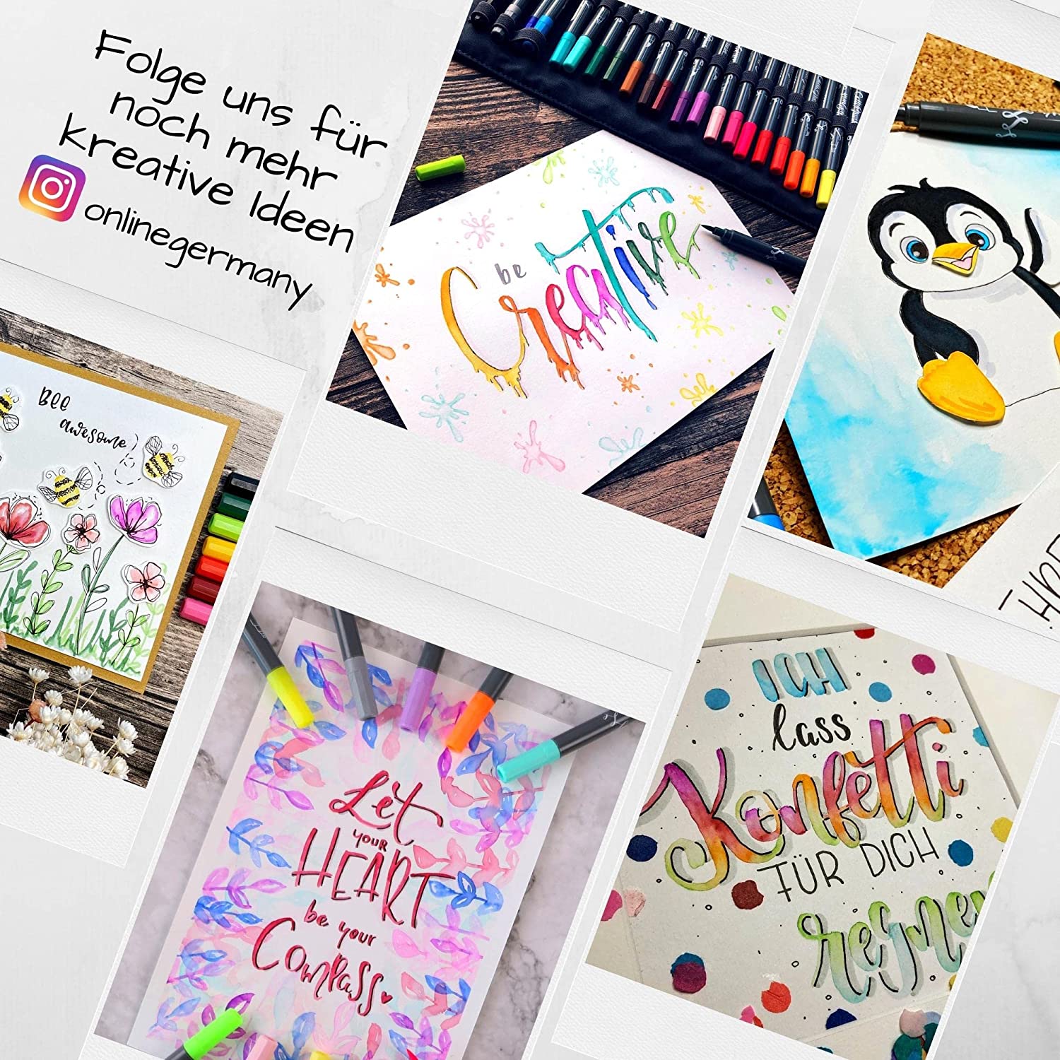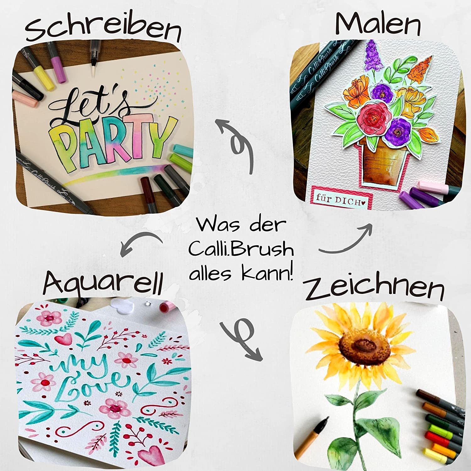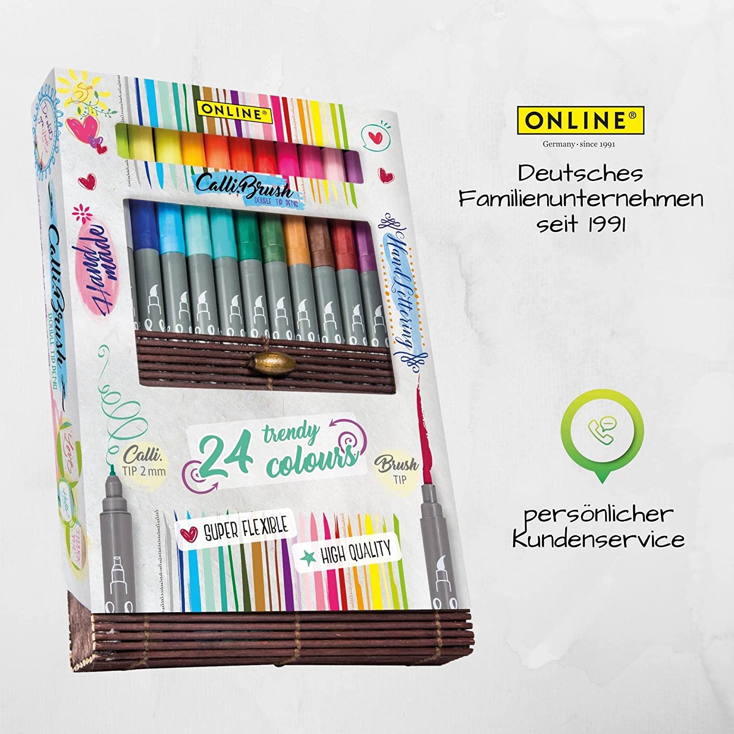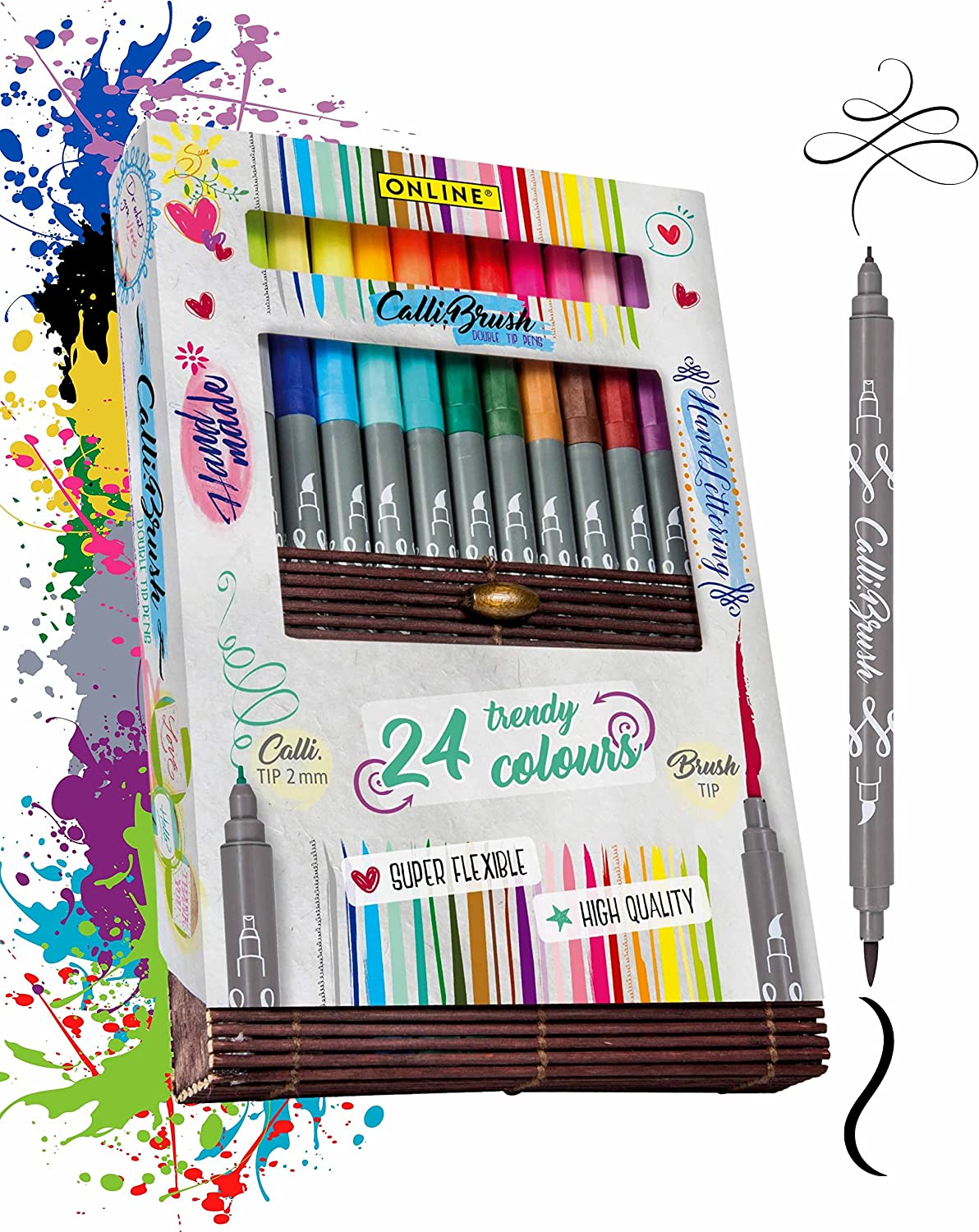 The Pen Roll with 24 Calli.Brush Double Tip Pens for creative writing Suitable for beginners The combination of the thin, angled nib with the wide brush nib allows diverse and creative design. The Calli.Brush Pens are for creative writing with calligraphy nib and brush nib and will increase your pleasure in creative activities involving writing, hand-lettering and lots of other possibilities. The main thing is to enjoy creating ideas and dip into the wonderful world of the handmade. The combination of the thin, angled nib with the wide brush nib allows diverse and creative design. It is enjoyable – and these days, anything created by hand is especially appreciated. The round Roll is made from textiles – a pleasant look and feel, functional fastener and a safe place for lots of different pens. The ideal accessory for anyone who loves writing, regardless of age. Excellent quality: Double tip with calligraphy nib and brush Calligraphy nib, 2 mm, for precise lining Flexible brush for creative writing & lettering Water-based ink Can be washed out of most textiles Safety by untoxic pigments Are most useful for: Beginner Hand-lettering and calligraphy Creative writing and designing Colouring your artworks Relaxed artistic creation