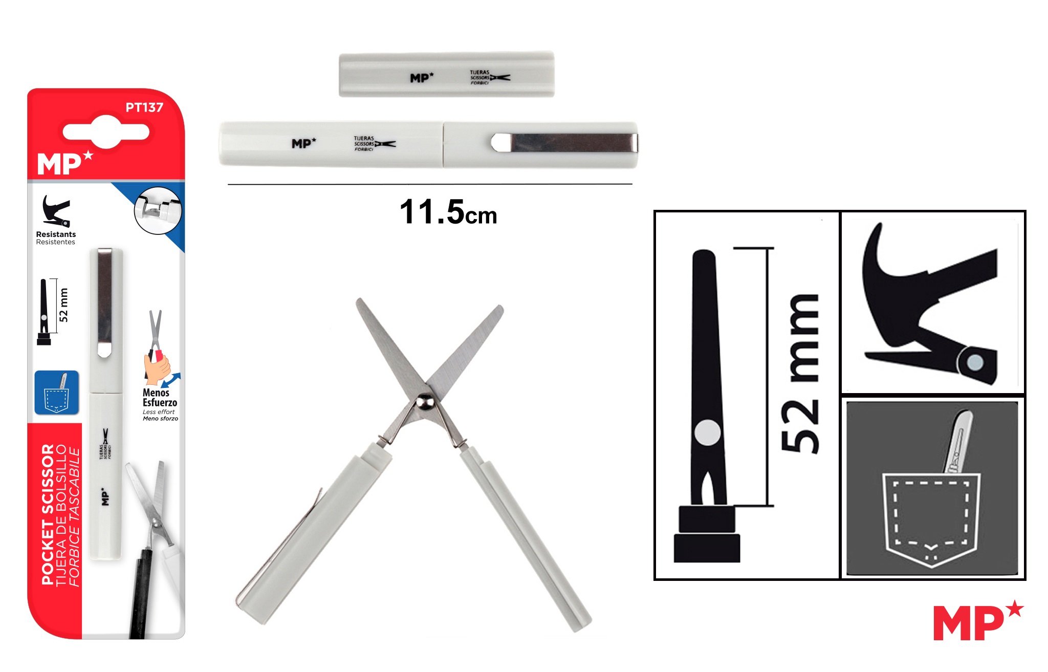 Pocket scissors. Mini size to store anywhere: 11.5cm.With a protective cap to prevent punctures andapen-type clip. They are foldable and lightweight,easyto carry. Gray. Blister of 1 unit.