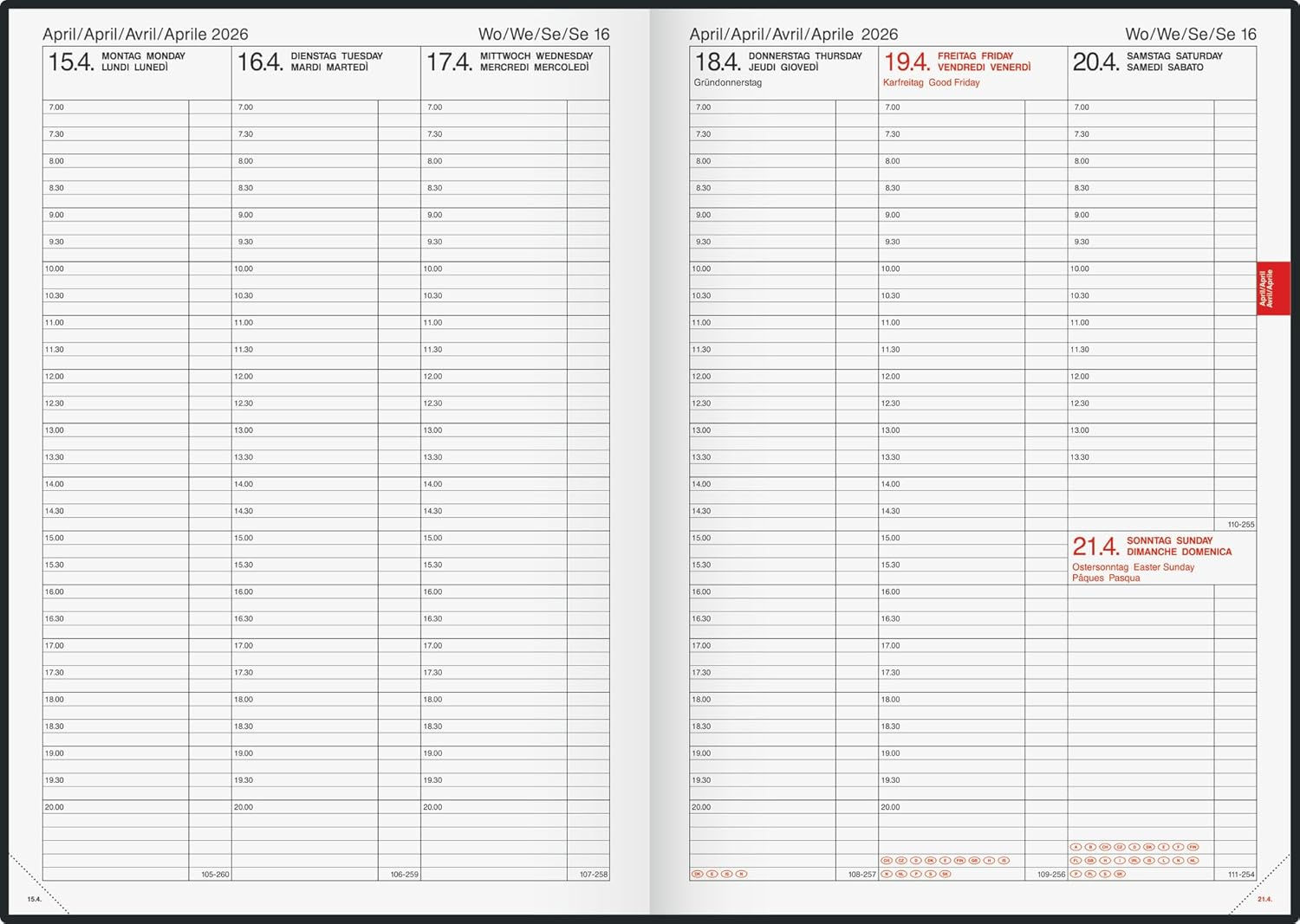 Navigare Rapidă: 🔖 Echipată cu două panglici de marcat (semne de carte) pentru a urmări simultan săptămâna curentă și o secțiune de notițe importante.