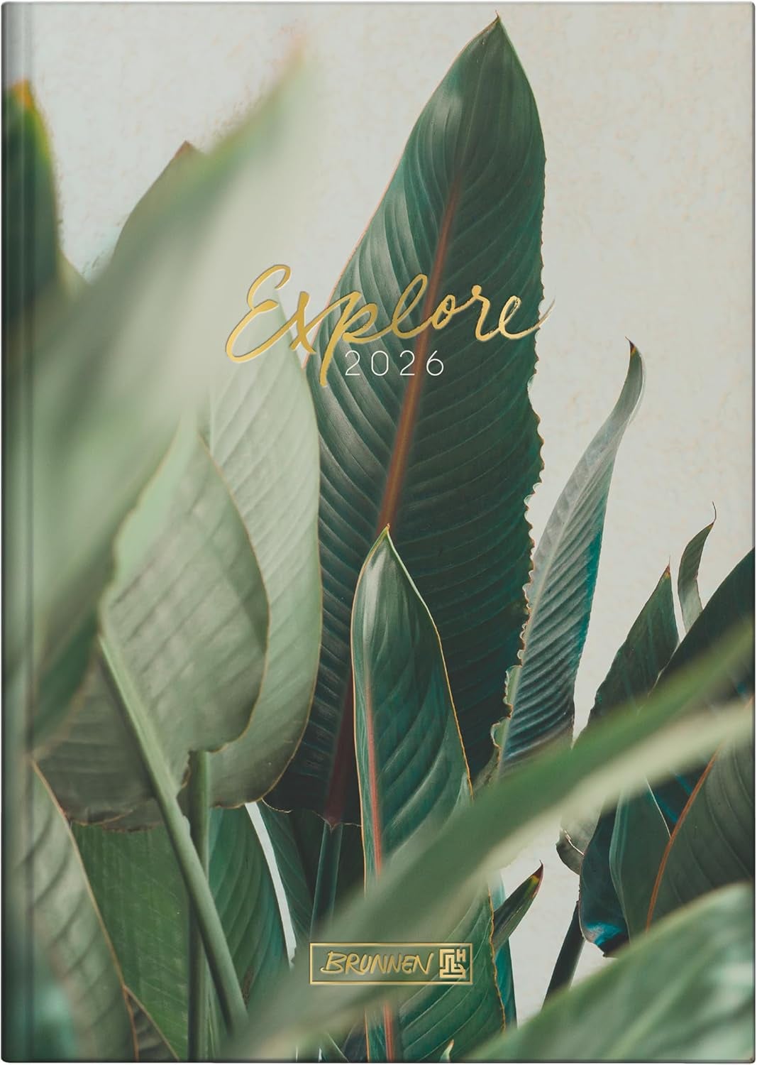 Agenda Brunnen A5 2026 – Model Explore este o agendă zilnică cu o pagină pentru fiecare zi, având structură orară extinsă de la 7:00 la 23:00 în timpul săptămânii și până la 20:00 în weekend, copertă hardcover cu grafică tematică "Explore" în culoarea verde închis și ștanțare aurie, fiind ideală pentru pasionați de călătorii și aventură care doresc o organizare detaliată și un design elegant, inspirat din spiritul explorării pentru un 2026 plin de energie și descoperiri.