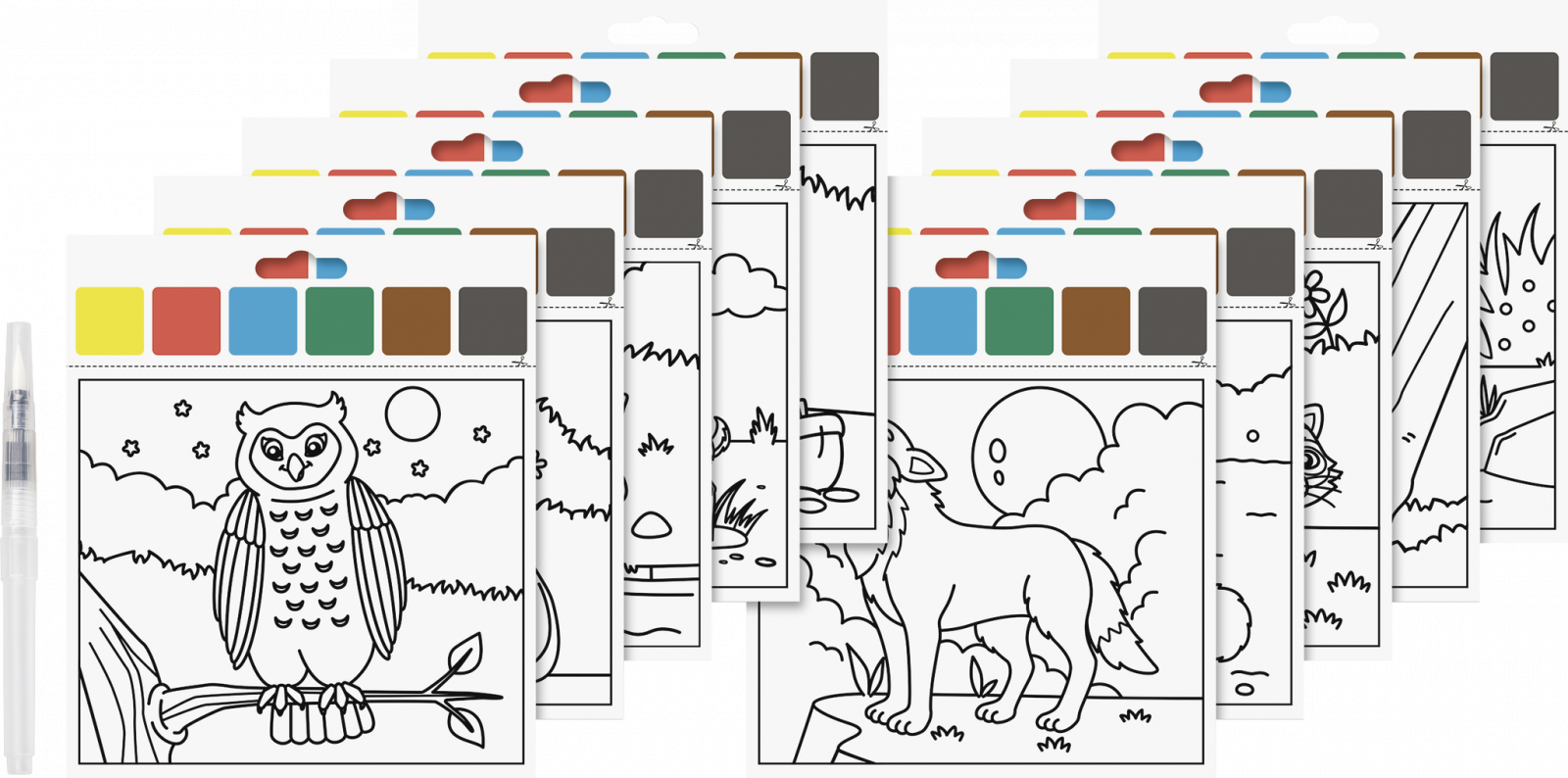 🅰️ Setul include 10 modele reprezentând animale din pădure, fiecare de 15×13 cm, și permite colorarea cu vopsele pe bază de apă folosind pensula cu rezervor, facilitând activitatea artistică fără riscul de scurgere sau murdărie