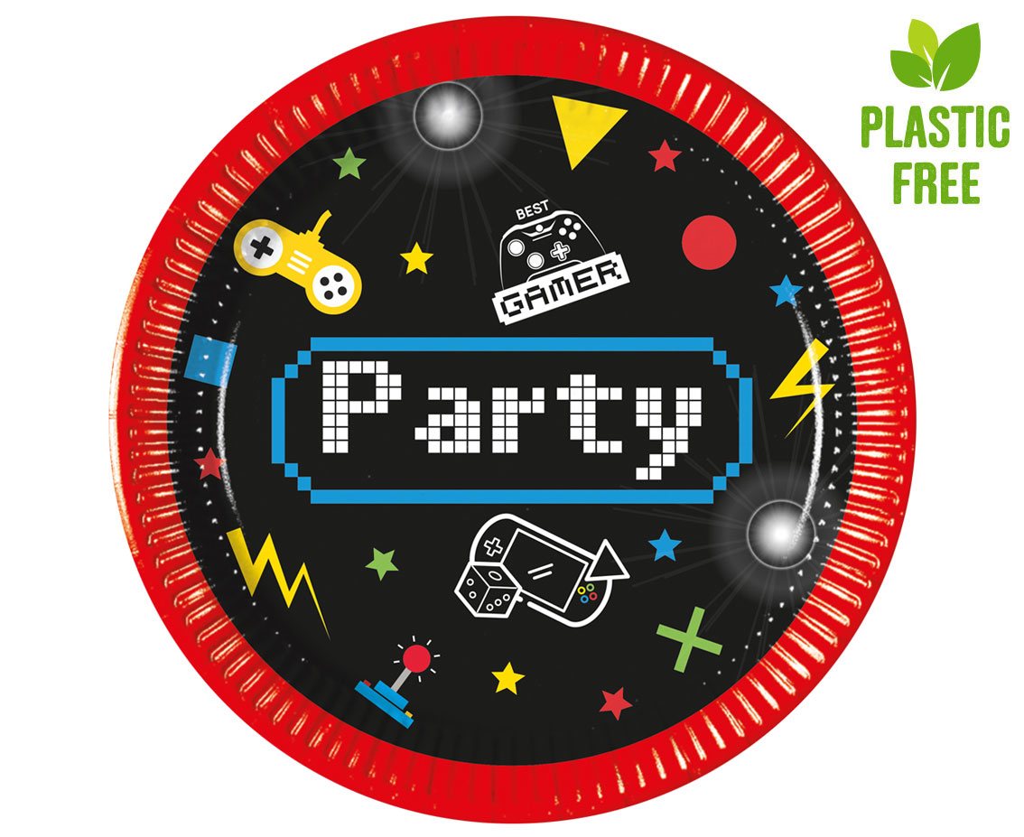 Farfuriile de hârtie cu imprimeu de jocuri pe calculator sunt un decor suplimentar pentru o petrecere de jocuri sau ziua de naștere a unui jucător. Farfuriile pentru petrecerea jocurilor se remarcă printr-un imprimeu atractiv, de înaltă calitate, în stilul jocurilor. Dacă copilul tău este un fan al jocurilor pe computer, de exemplu Minecraft, Battle Royal sau Mario, el va fi încântat de o petrecere de aniversare în stilul jocurilor pe calculator. Farfuriile de hârtie sunt potrivite atât pentru vase calde, cât și pentru preparate reci. Imprimeul de înaltă calitate atrage atenția și iese în evidență printre vesela. Farfuriile de hârtie pentru petrecerea de jocuri sunt un must-have pentru fiecare petrecere LAN cu prietenii! Farfuriile sunt realizate 100% din hartie. Nu conțin un singur gram de plastic. Mănâncă și petrece în armonie cu Natura.