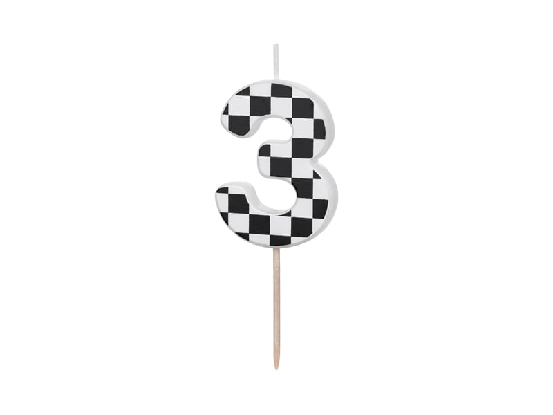 Transformați tortul de aniversare într-o experiență plină de energie și entuziasm cu această lumanare în formă de cifra 3, decorată cu un model de steag în carouri!