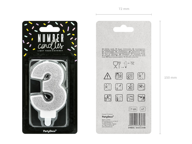 Birthday candle Number 3, silver glittery, size approx. 7 cm.