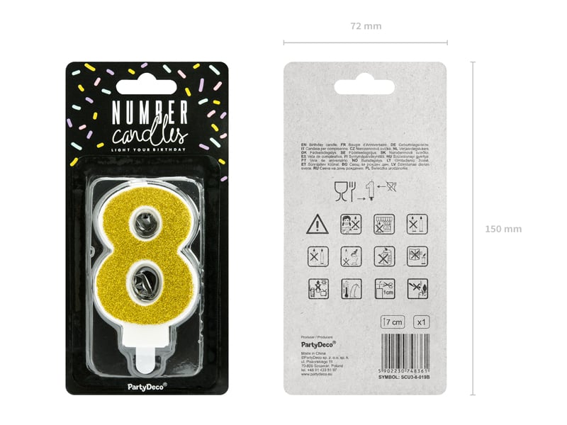 Birthday candle Number 8, gold glittery, size approx. 7 cm.