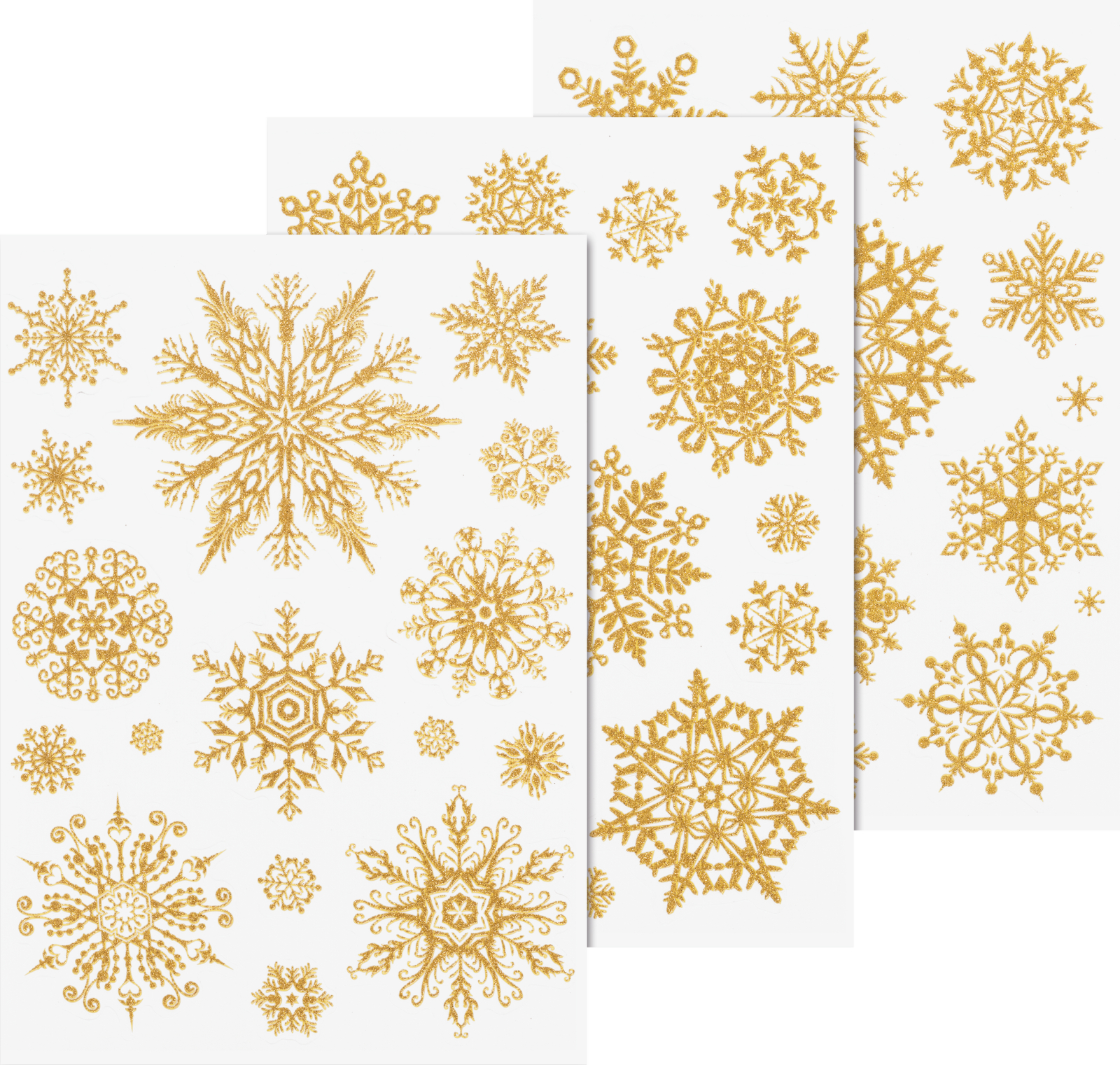 Setul conține 3 coli de stickere realizate din folie, având o culoare festivă de Auriu cu Sclipici (Glitter Gold). Pe cele 3 coli sunt incluse un total de 48 de motive, reprezentând fulgi de zăpadă și cristale de gheață.