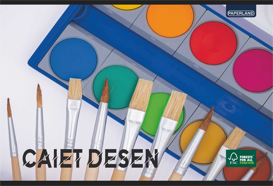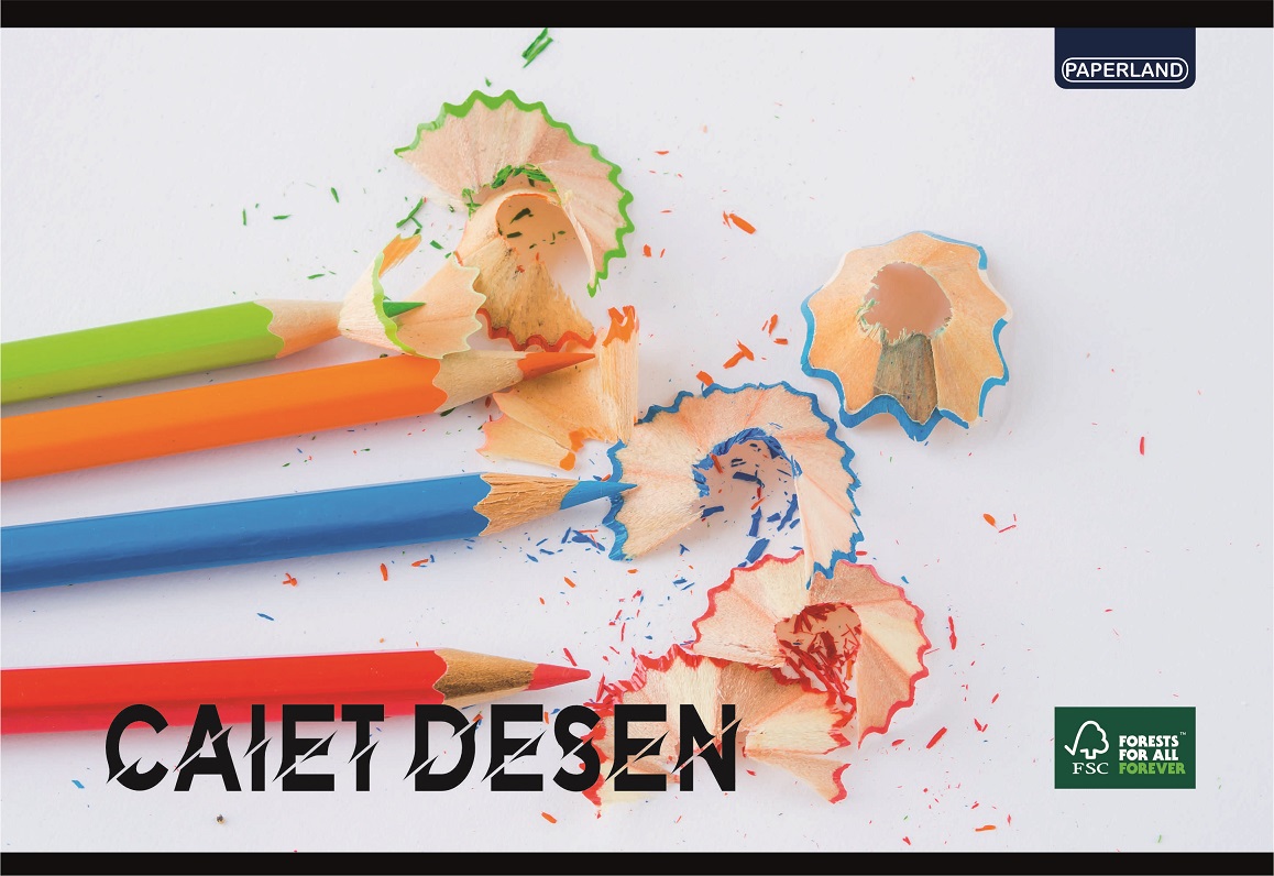 Caiet de desen, dimensiune 23 x 16,7 cm, coperti policromie, carton duplex, hartie 60 g/mp, 24 file, velin, capsat