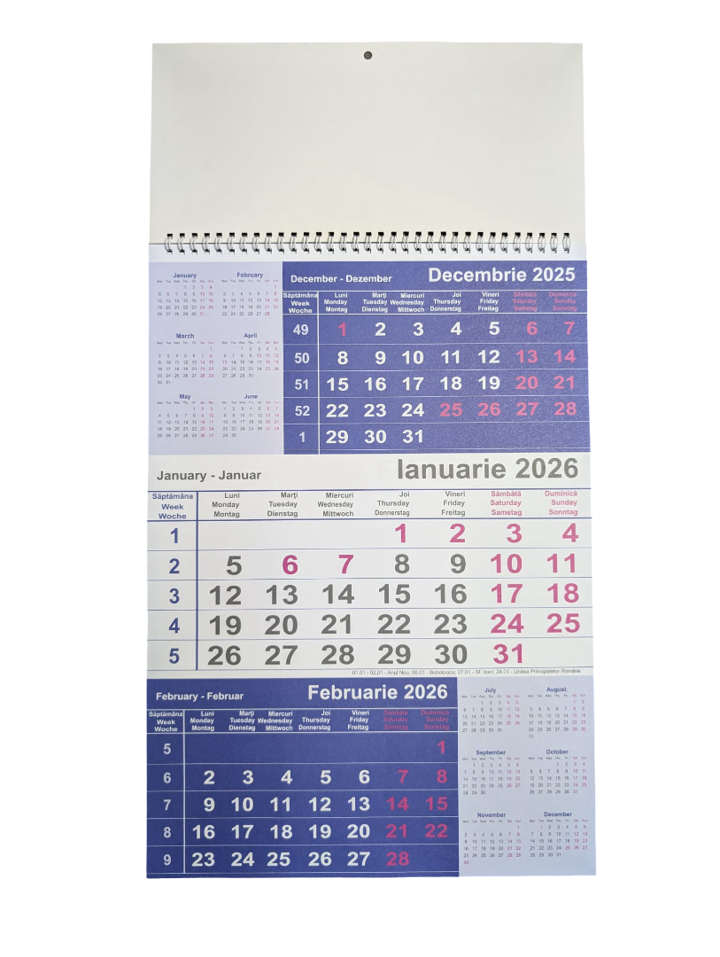 Calendarul triptic de perete 2026 oferă o vizualizare clară și eficientă a trei luni pe fiecare filă, facilitând planificarea pe termen scurt și mediu, evidențiind zilele libere cu roșu, fiind ideal atât pentru birou, cât și ca material de promovare datorită zonei de personalizare generoase.