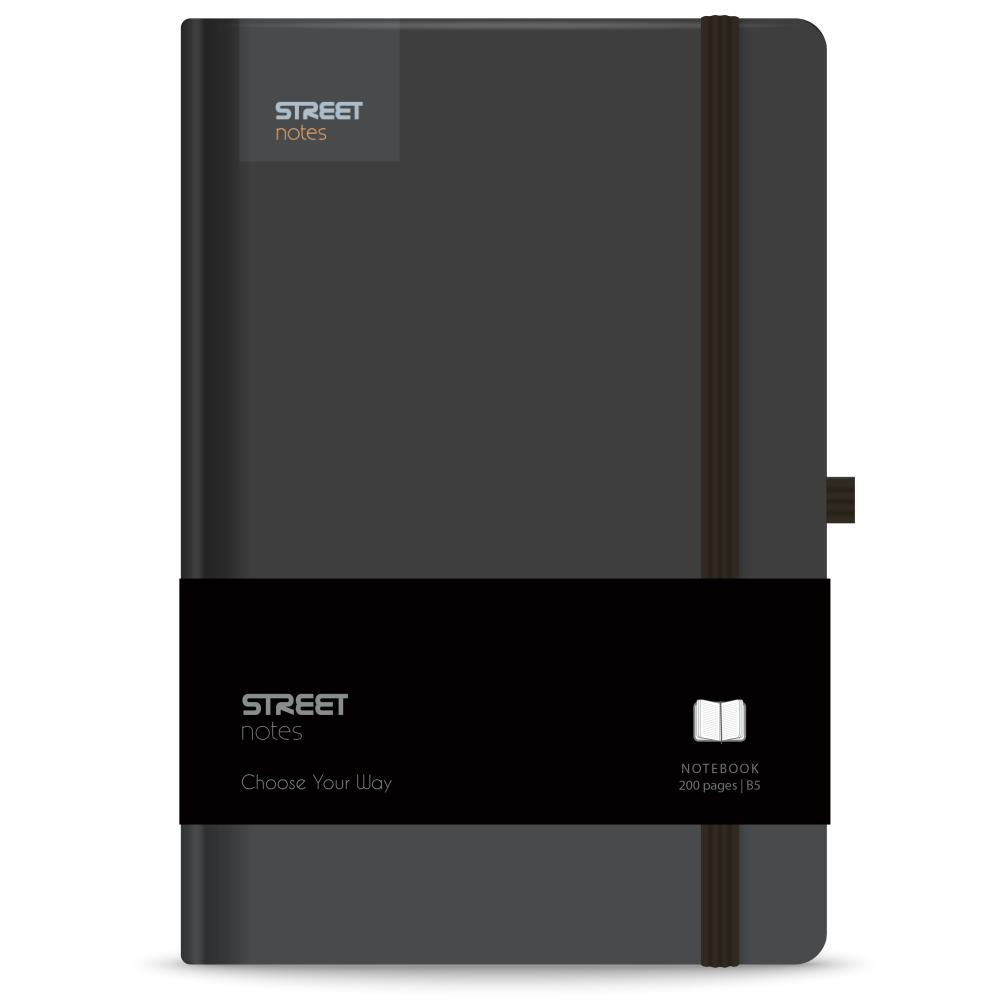 Caiet B5 cu 96 de coli, cu elastic și copertă cartonată Casual Black, de dimensiuni 17x24 cm, ideal pentru notițe, planificare și scris în stil minimalist și elegant.