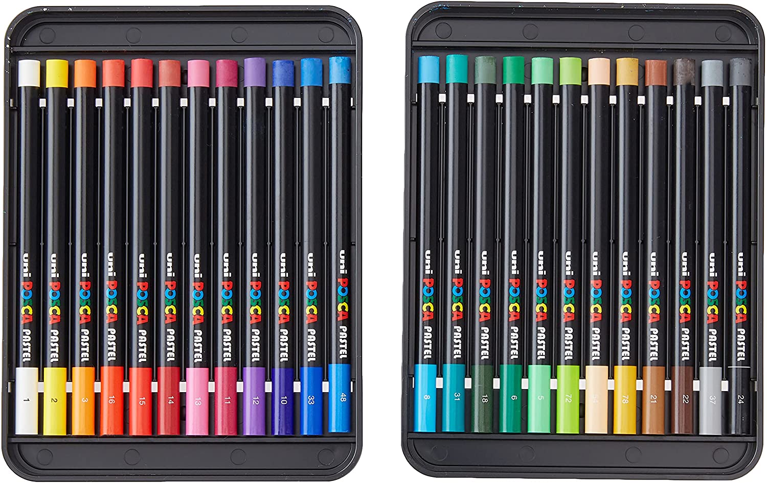 O nouă gamă de creioane pastel completează colecția de culori POSCA, disponibile în 24 de culori vii si rezistente la apă. Creioanele pastel POSCA se pot folosi pe o gamă largă de suprafețe. Pastelurile POSCA va oferă un mod placut și expresiv de a schița, colora sau picta. În plus, puteți încălzi creioanele pentru a crea efecte texturate. Fiecare creion pastel măsoara ~11cm lungime cu un diametru de 6.3 mm și este înfășurat într-un manșon de hârtie. Formula lor unică este bazata pe ceară, astfel încât culorile sunt vibrante și naturale, cu un finisaj super neted. Acest lucru înseamnă, de asemenea că sunt extrem de ușor de utilizat, nelăsând aproape niciun reziduu pe suprafata. Setul de creioane pastel POSCA vine intr-o cutie de plastic dur, ideala pentru depozitare, care asigura protectia si integritatea creioanelor. Setul de creioanele pastel POSCA contine urmatoarele culori: alb, galben, galben strălucitor, vermilion, roșu, roșu închis, roz, fucsia, violet, albastru prusac, albastru, sky blue, albastru deschis, verde smarald, măslin închis, verde, verde deschis, verde măr, portocaliu deschis , ocru deschis, maro, maro închis, gri și negru. Fade-resistant Set comes in a durable hard-shell case Highly blendable