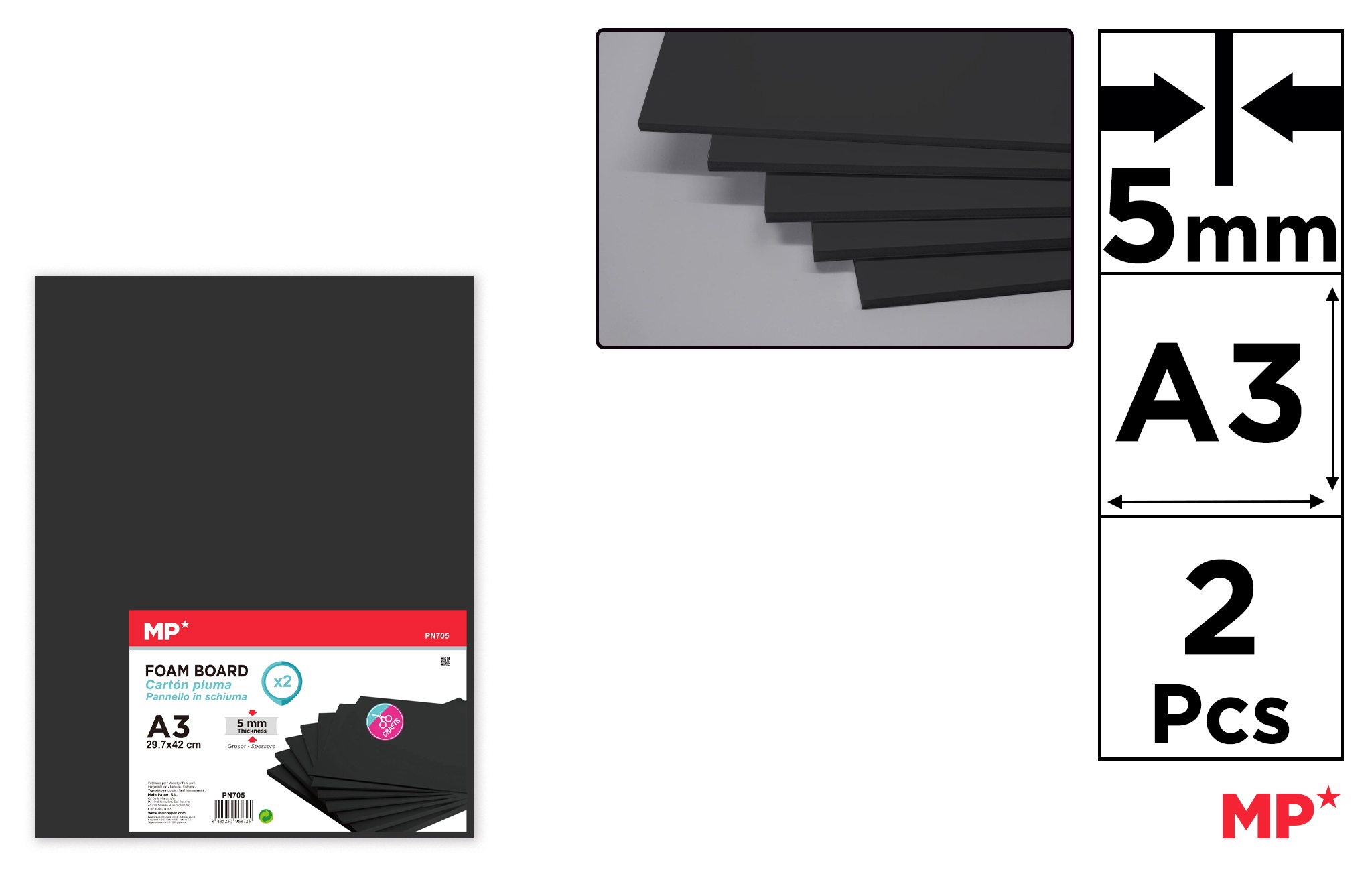 Adhesive foam board made of light polyurethanefoamwith two sides of cardboard. One side isadhesive.Great rigidity and very light. Perfectformockups and as a support for images. You cancut,paste and click on it. Thickness: 5 mm. A3size.Measurements: 420 x 297 mm. Black colour.