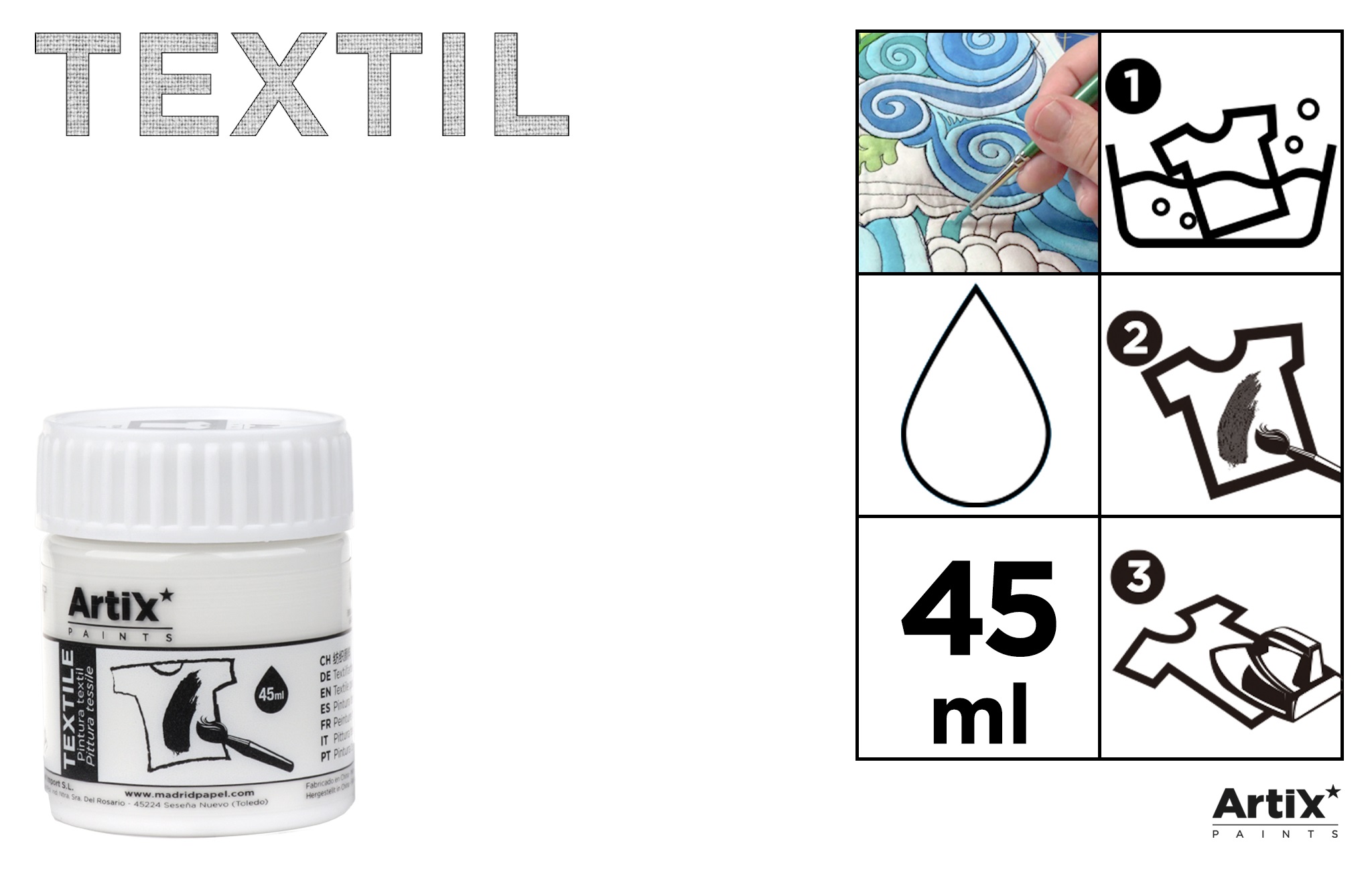 Formulată special pentru aplicare pe țesături, această vopsea este foarte ușor de utilizat cu pensule, oferindu-ți controlul necesar pentru a crea detalii precise și linii clare. După aplicare, se recomandă spălarea hainelor și, odată ce vopseaua s-a uscat complet, călcatul fără abur pentru a fixa culorile în mod corespunzător.