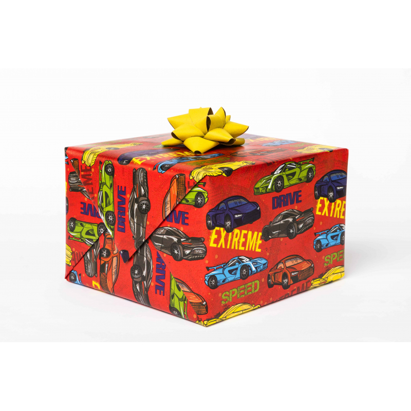 Hârtie de ambalaj de la Pol-Mak, dimensiuni 200x70 cm, cu modele diverse pentru copii, inclusiv mașini, animale, blocuri și curcubeu, ideală pentru împachetări tematice și decorări festive.