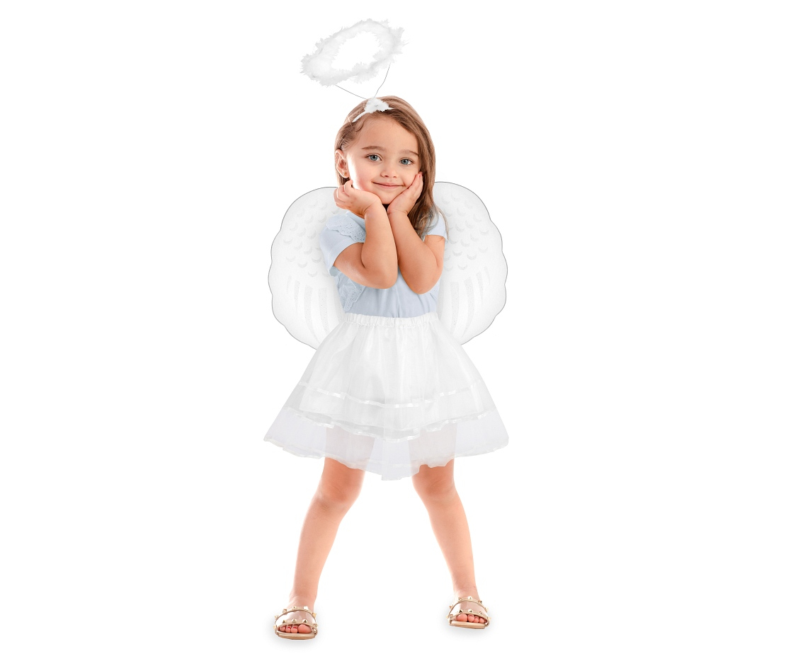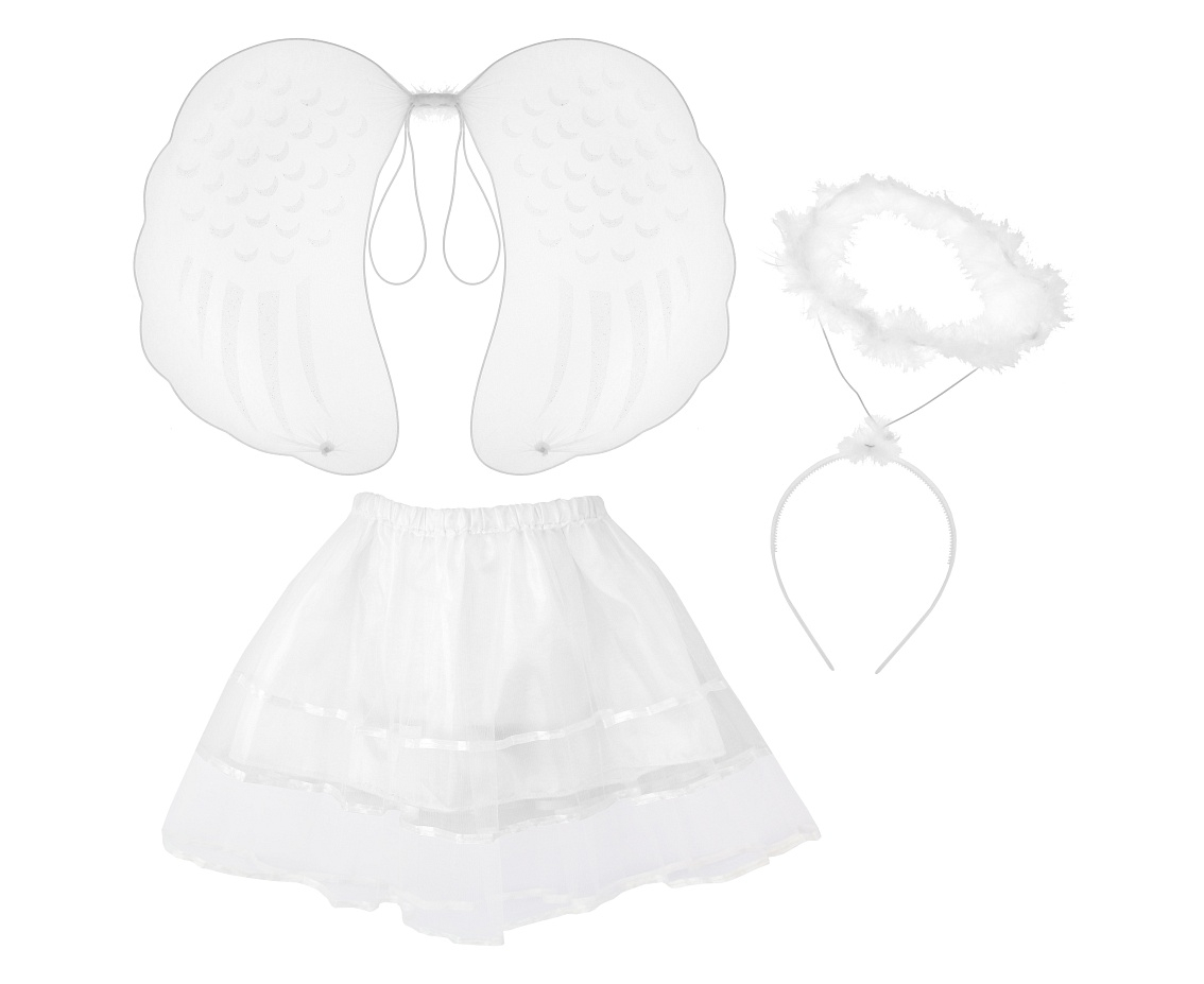 Setul include trei elemente esențiale: o fustă albă elegantă, decorată cu panglici delicate la margini, care îi conferă un aspect fluid și angelic. De asemenea, sunt incluse aripioare albe, ușoare și o aură pufoasă prinsă pe bentiță, care completează strălucirea subtilă a costumului. Materialele delicate și finisajul atent asigură un confort sporit.