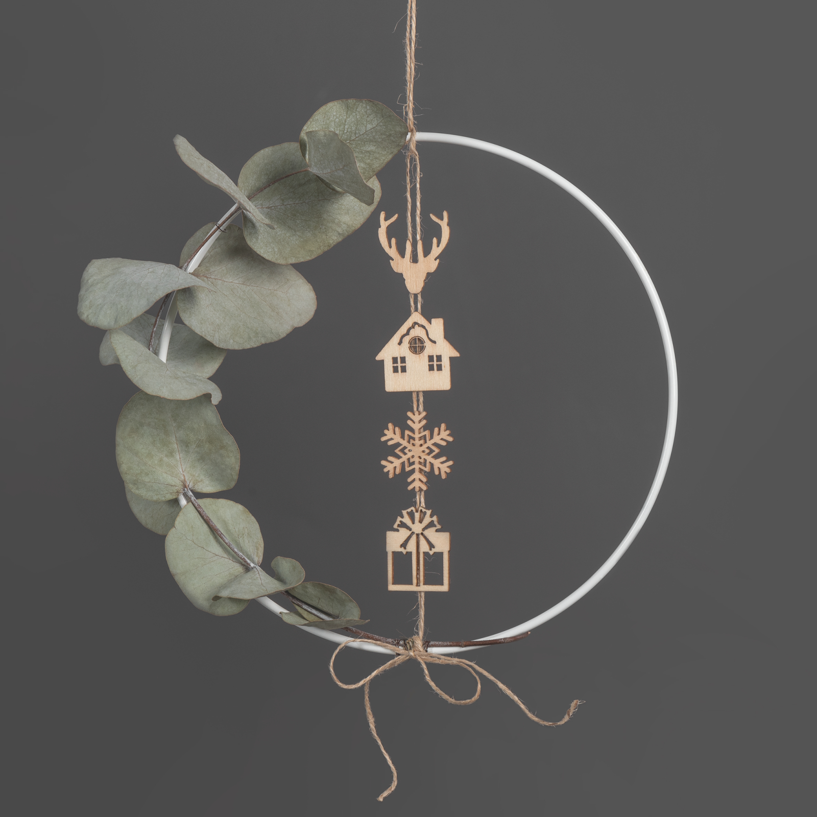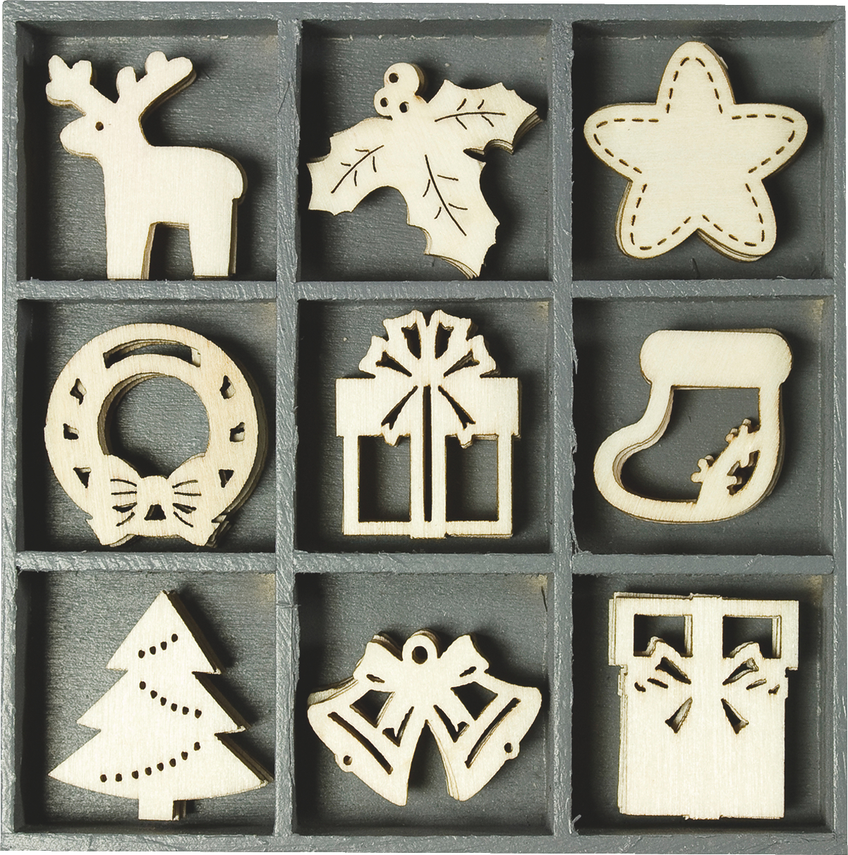 Decorațiunile sunt realizate din placaj și au dimensiunea ideală de 30 mm pentru a fi folosite la confecționarea felicitărilor, decorarea cadourilor sau ca ornamente pentru brad. Setul include 9 modele diferite (deși nu sunt specificate, se deduce din asortimentul larg).