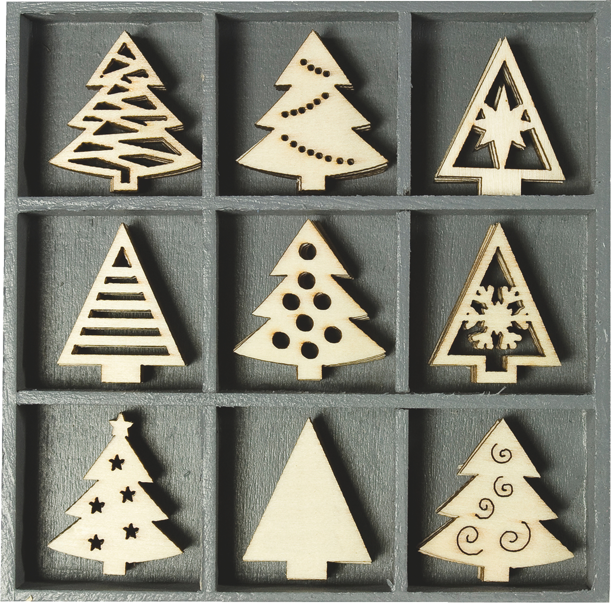 Cutia conține un asortiment de 45 de piese din lemn natural. Decorațiunile sunt realizate din placaj și au dimensiunea ideală de 30 mm. Setul include 9 modele diferite, toate centrate pe tematica Bradului de Crăciun.