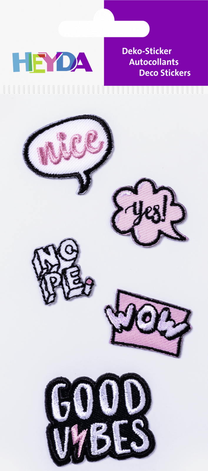 Descoperă setul de stickere textile KP Good Vibes 7,5x16,5cm (3782838) și Heyda Textile Stickers “Good Vibes” 75×165 mm, ideale pentru personalizarea hainelor, accesoriilor sau proiectelor creative textile, fiind realizate din fibre textile cu adeziv pe verso.