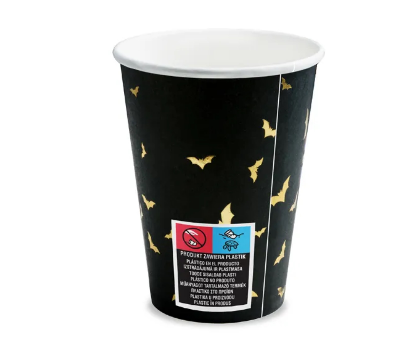Paper cups Trick or Treat, black with gold pattern, hold up to 220 ml (7.4 oz). Beverage cups bear the printed marking required by Commission Implementing Regulation (EU) 2020/2151 of 17 December 2020 laying down rules on harmonised marking specifications on single-use plastic products listed in Part D of the Annex to Directive (EU) 2019/904 of the European Parliament and of the Council on the reduction of the impact of certain plastic products on the environment. The product is labelled only in Polish, Spanish, Latvian, Estonian, Portuguese, Hungarian, Greek, Croatian and Romanian. (1 pkt / 6 pc.)