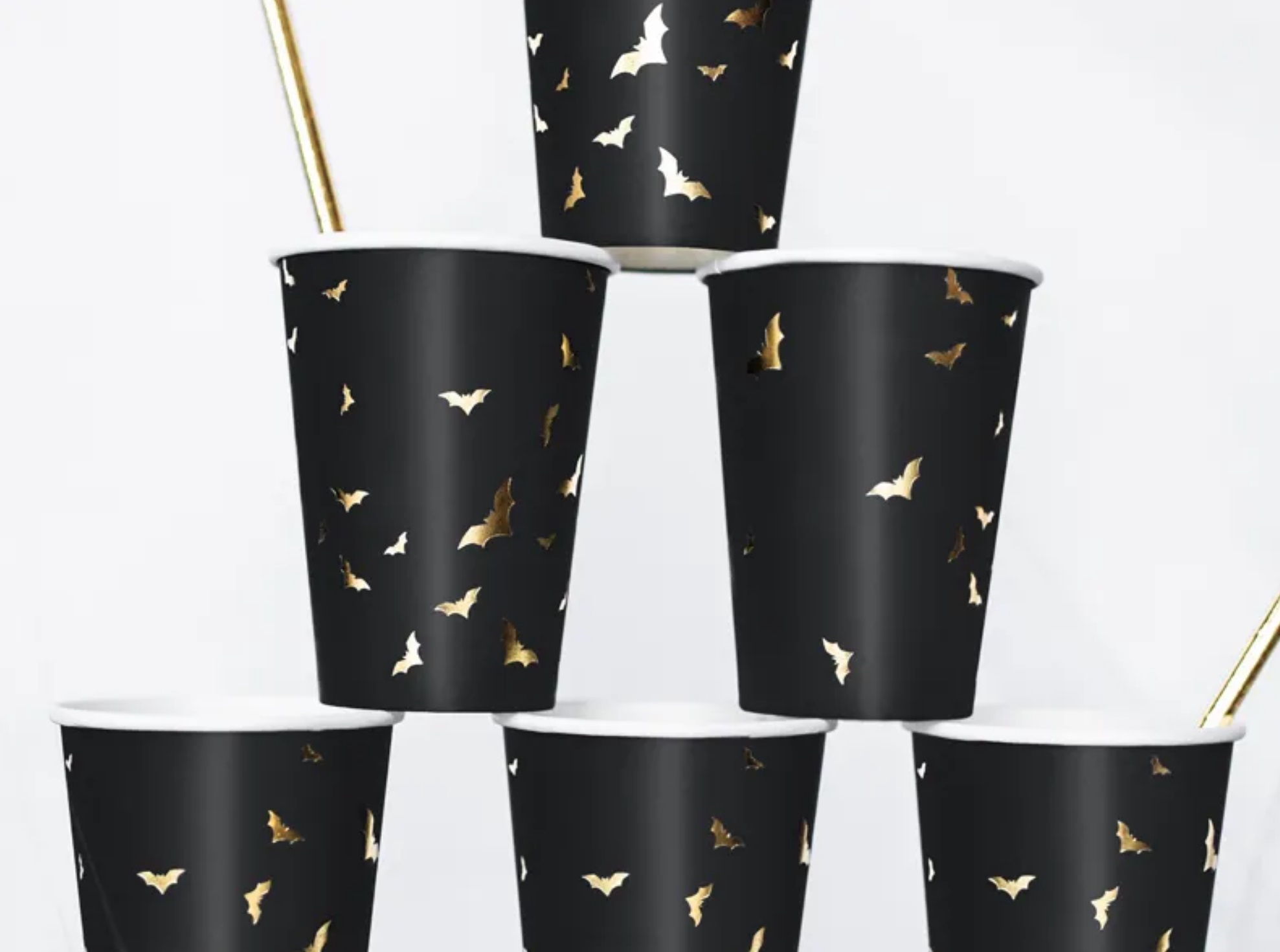Pahare de hârtie Trick or Treat, negre cu model auriu, au o capacitate de până la 220 ml (7,4 oz). Paharele pentru băuturi poartă marcajul imprimat cerut de Regulamentul de punere în aplicare (UE) 2020/2151 al Comisiei din 17 decembrie 2020 de stabilire a normelor privind specificațiile armonizate de marcare a produselor din plastic de unică folosință enumerate în partea D din anexa la Directiva (UE) 2019/904 din Parlamentul European și al Consiliului privind reducerea impactului anumitor produse din plastic asupra mediului. Produsul este etichetat numai în poloneză, spaniolă, letonă, estonă, portugheză, maghiară, greacă, croată și română. (1 buc. / 6 buc.)