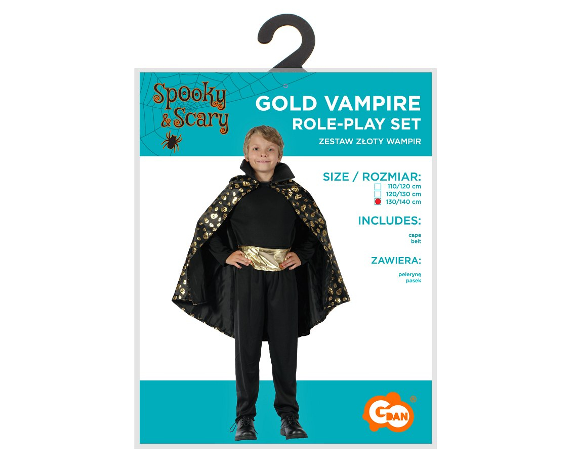 Costumul de Vampir Auriu pentru copii 130/140 cm de la Godan este ideal pentru micii pasionați de personaje fantastice și Halloween, incluzând o pelerină elegantă cu model auriu și o curea asortată, toate realizate din poliester de înaltă calitate pentru confort și durabilitate.