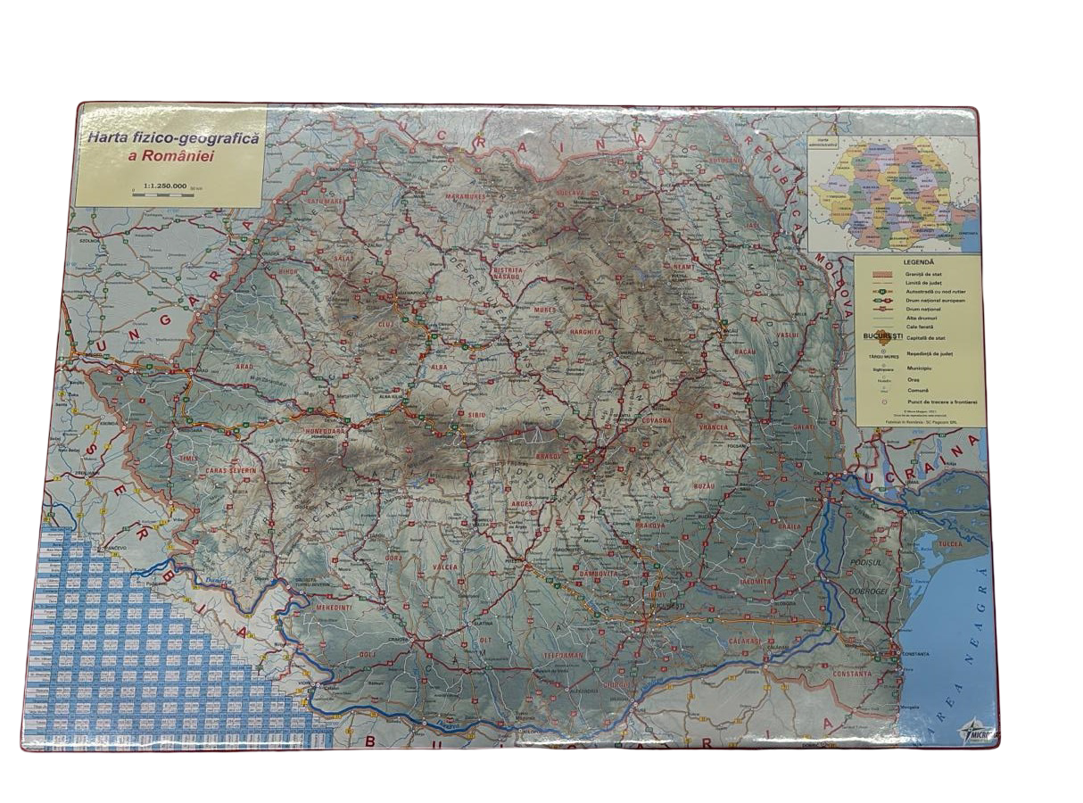 Specificații: mapă de birou cu harta fizico-geografică detaliată a României, suprafață plastificată lavabilă