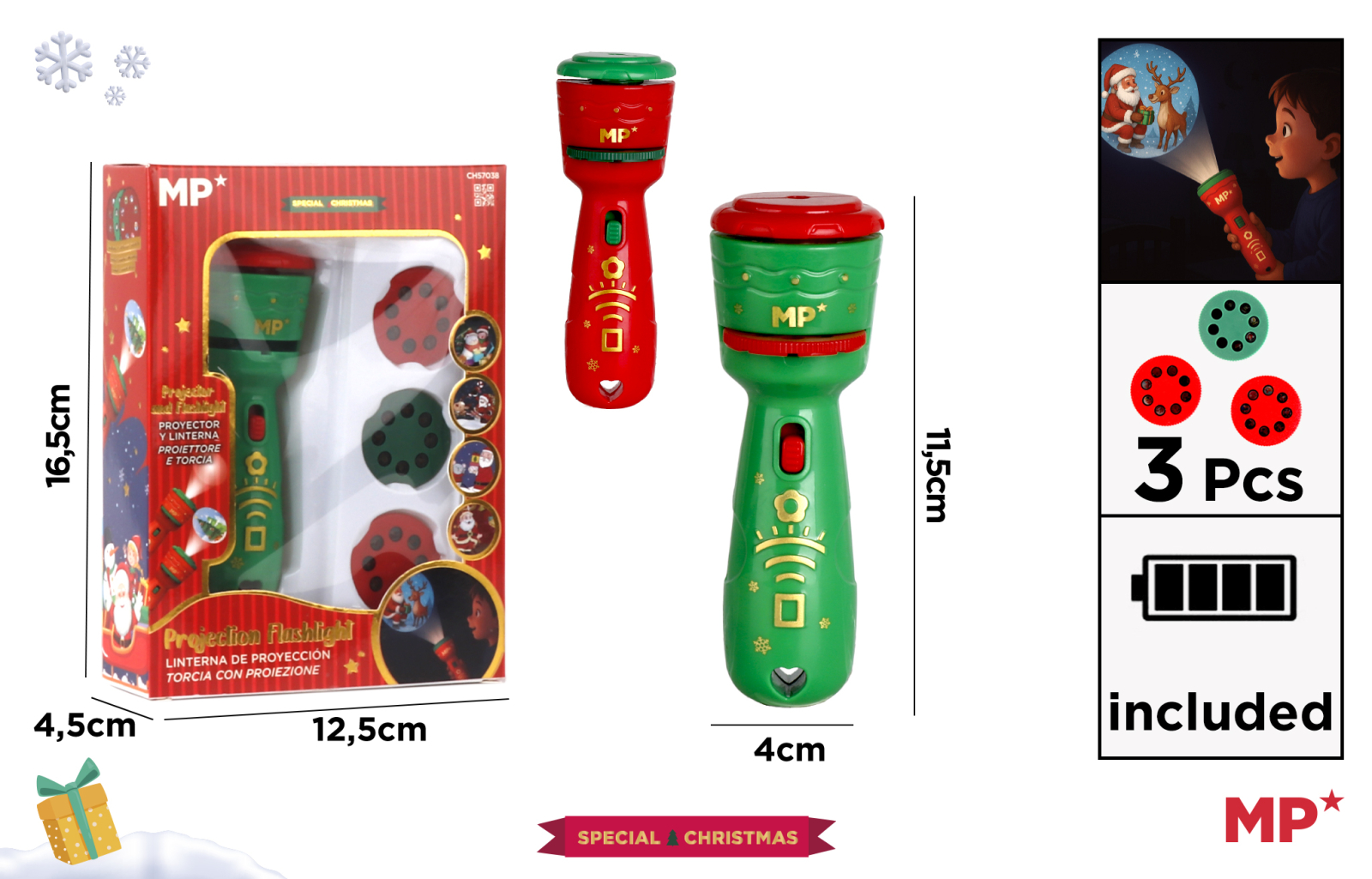 Această lanternă cu proiector (Projection Flashlight) de la MP* face parte din colecția Special Christmas și este o jucărie educativă și distractivă, perfectă pentru a spune povești de Crăciun.