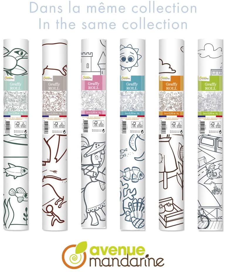 Avenue Mandarine este un brand francez de jocuri educative aparținând grupului Clairefontaine Rhodia. Produsele noastre de înaltă calitate îndeplinesc cerințele dumneavoastră pentru a vă satisface dorintele copiilor și a-i însoți în descoperirea, jocul și trezirea simțurilor lor. Un suport ideal pentru a distra copiii. Puteți derula ruloul, îl puteți lipi pe un perete sau pe o masă mare și îi lăsați pe copii să deseneze pe setul de desene. Sau puteți decupa fiecare dintre scene pentru 10 sesiuni sau 10 copii diferiți. Ideal pentru comunități, creșe, familii numeroase sau pur și simplu pentru a ocupa un copil într-o zi ploioasă. Roll in poster pictat 90 g - 50 cm desen repetat de 10 ori pe rola O rolă ușor de depozitat, care nu va ocupa spațiu în dulapurile tale.