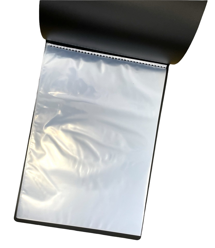 Coperta este confectionata din plastic rigid de 650 de microni, iar in interior este prevazuta cu 20 de folii transparente de 38 de microni.