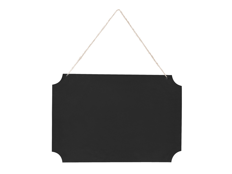 Hanging chalkboard sign, black, with a free text field, made of thick paper with jute twine. The set includes 2 chalks: white and red. Size 45x30 centimeters. 1 pkt / 1 pc. symbol: TDZ7