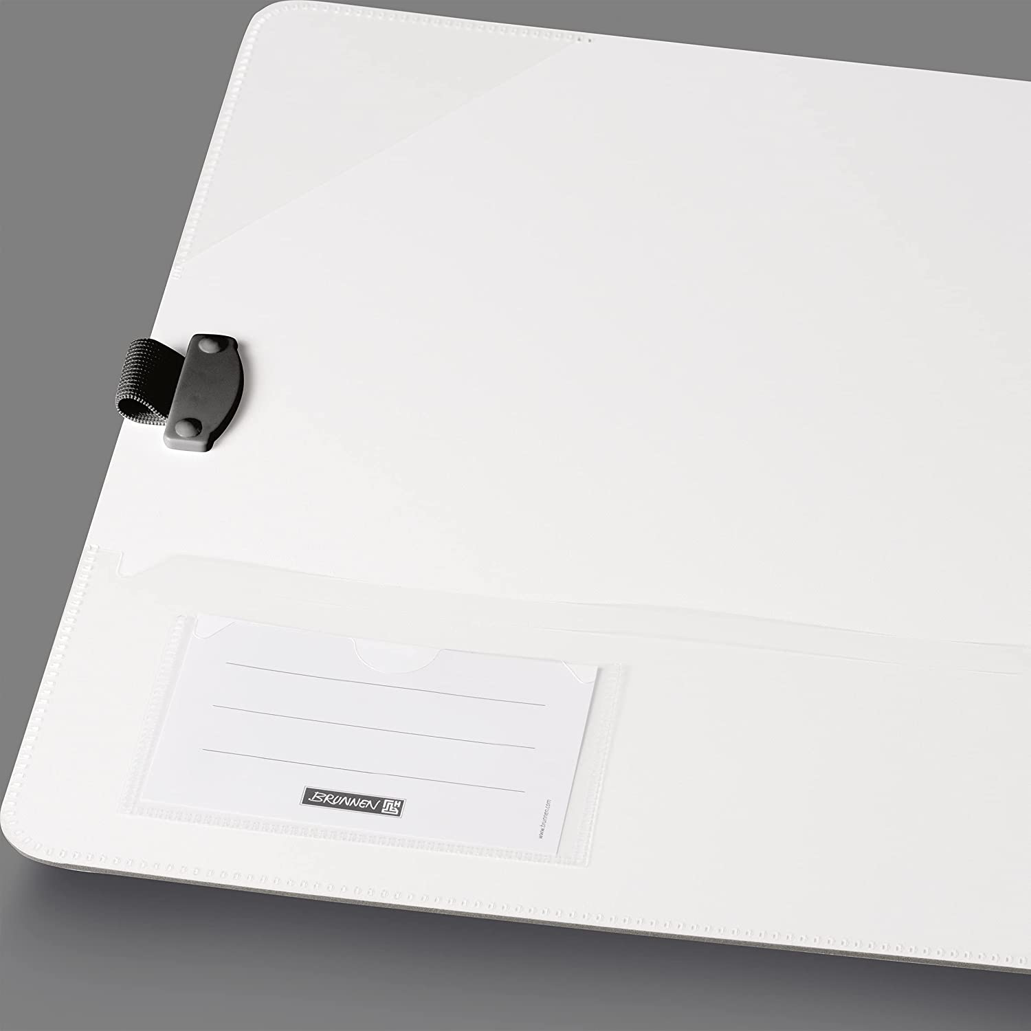 Buclă pentru pix, închidere elastică, buzunar pe coperta frontală, spate plat cu etichetă de scris