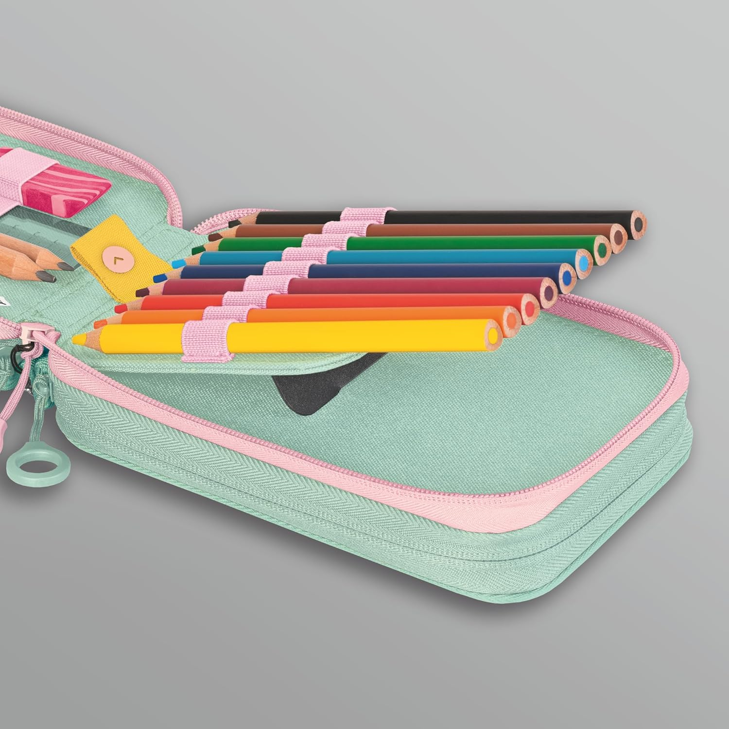 • Accesorii incluse: 18 creioane subțiri, 9 creioane groase, 2 creioane grafit, riglă 16 cm, ascuțitoare dublă, radieră, foarfecă copii, pandantiv, compartiment bani