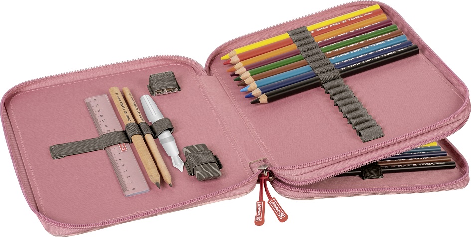 · 8 carioci · 2 creioane grafit · 1 pix · 1 radiera · 1 ascutitoare · 1 rigla 16 cm · 1 echer · inchidere cu fermoar