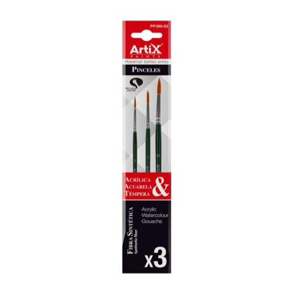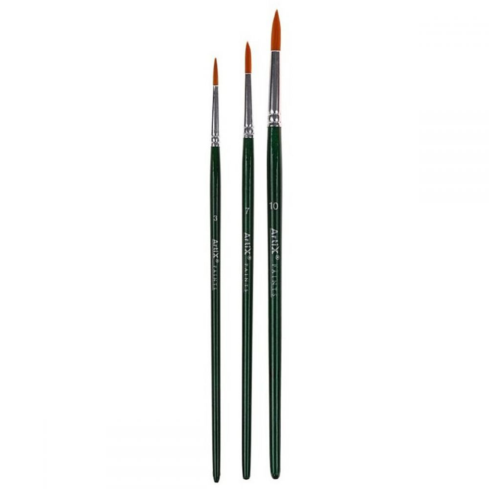 Set pensule profesionale din par sintetic, cu varf rotund si coada scurta, Artix. Pensule rezistente potrivite pentru majoritatea tehnicilor de pictura, de la culorile acrilice, pana la acuarele, tempera sau guase. Acest tip de pensula este ideala pentru trasarea unor linii groase pana la subtiri, fara a ridica pensula de pe suprafata de lucru, permite realizarea detaliilor sau umplerea suprafetelor. Setul contine marimile: 3, 7, 10. Culoare coada: verde. Pretul se refera la un set de 3 pensule.