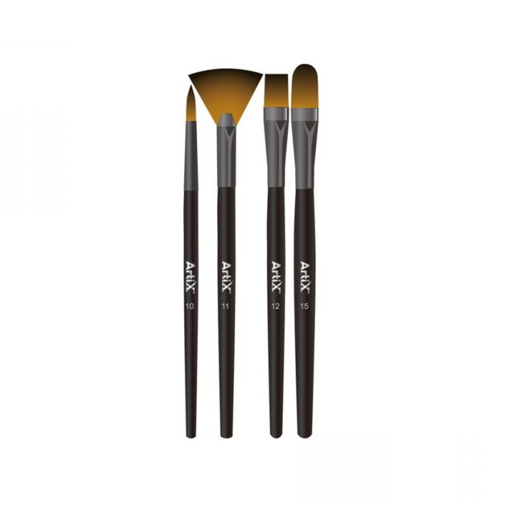 Set pensule profesionale din par sintetic, cu coada scurta, varf rotund, drept, evantai si coada de pisica, Artix. Pensule rezistente potrivite pentru majoritatea tehnicilor de pictura, de la culorile acrilice, pana la acuarele, tempera sau guase. Acest tip de pensule sunt ideale pentru trasarea de linii groase pana la subtiri, permit realizarea detaliilor sau umplerea suprafetelor. Pensula evantai este ideala pentru obtinerea de tuse de culoare din linii subtiri sau groase. Este frecvent folosita in peisagistica, in pictura frunzisului, a norilor, apei, dar si in mixed media, unde poate ajuta la crearea unor fundaluri neuniforme. Totodata pensula cu varf limba de pisica este utila in umplerea zonelor circulare, a formelor rotunjite, pentru obtinerea efectului de culoare plutitoare, a formei naturale la petale de flori, frunze, pene. Setul contine: 1 pensula cu varf rotund nr. 10; 1 pensula cu varf drept nr. 12; 1 pensula evantai nr. 11; 1 pensula cu varf limba de pisica nr. 15. Pretul se refera la un set de 4 pensule.