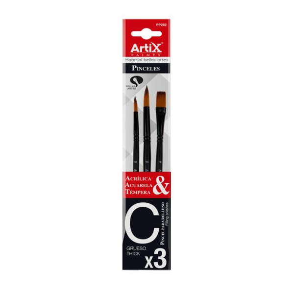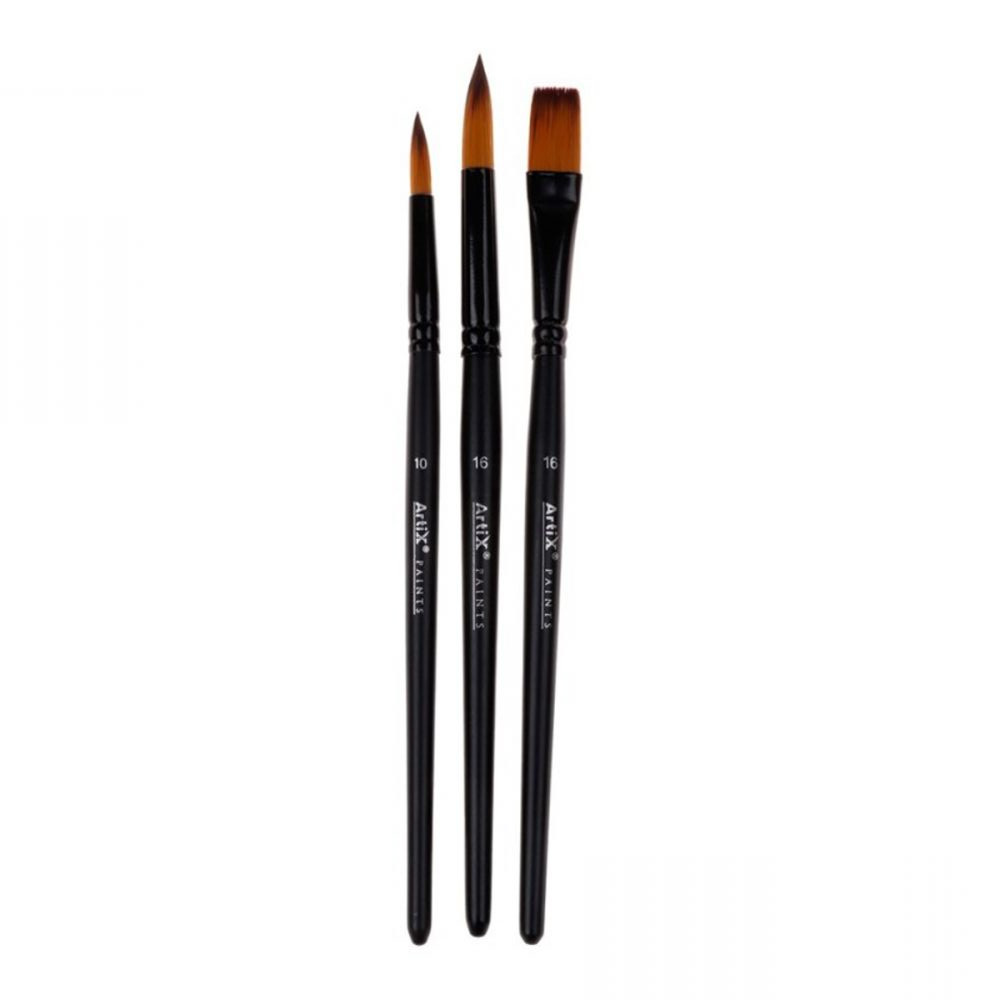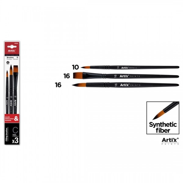 Pensula profesională pentru pictură, cu peri foarte moi din păr sintetic. Setul include două pensule rotunde pentru contur și o pensulă plată cu o lățime generoasă (G), perfecte pentru pictură și șpaclu, cu culori acuarele, tempera sau acrilice. Corpul pensulei este din lemn, lacuit în negru. Lungime: 21 cm. Ambalate într-un blister de 3 bucăți: 2 pensule rotunde cu numerele 10 și 16, și o pensulă plată cu numărul 16.