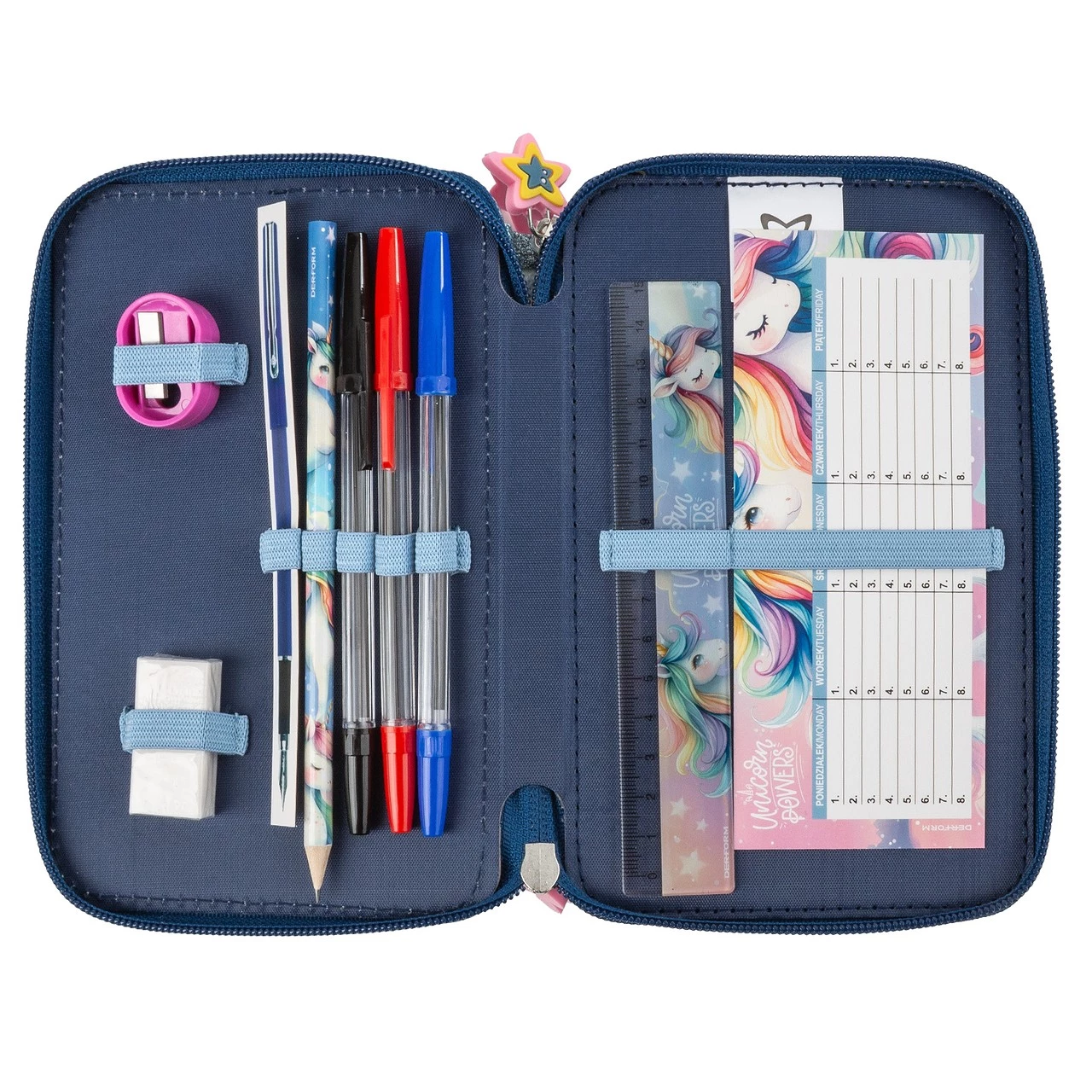 🦄 Penarul UNICORN combină stilul de basm cu funcționalitatea de zi cu zi. Cu trei compartimente spațioase, acesta conține toate rechizitele școlare, iar adorabila aplicație cu unicorn va aduce o atmosferă magică oricărei bănci de școală. Perfect pentru copiii care iubesc culoarea și ordinea!