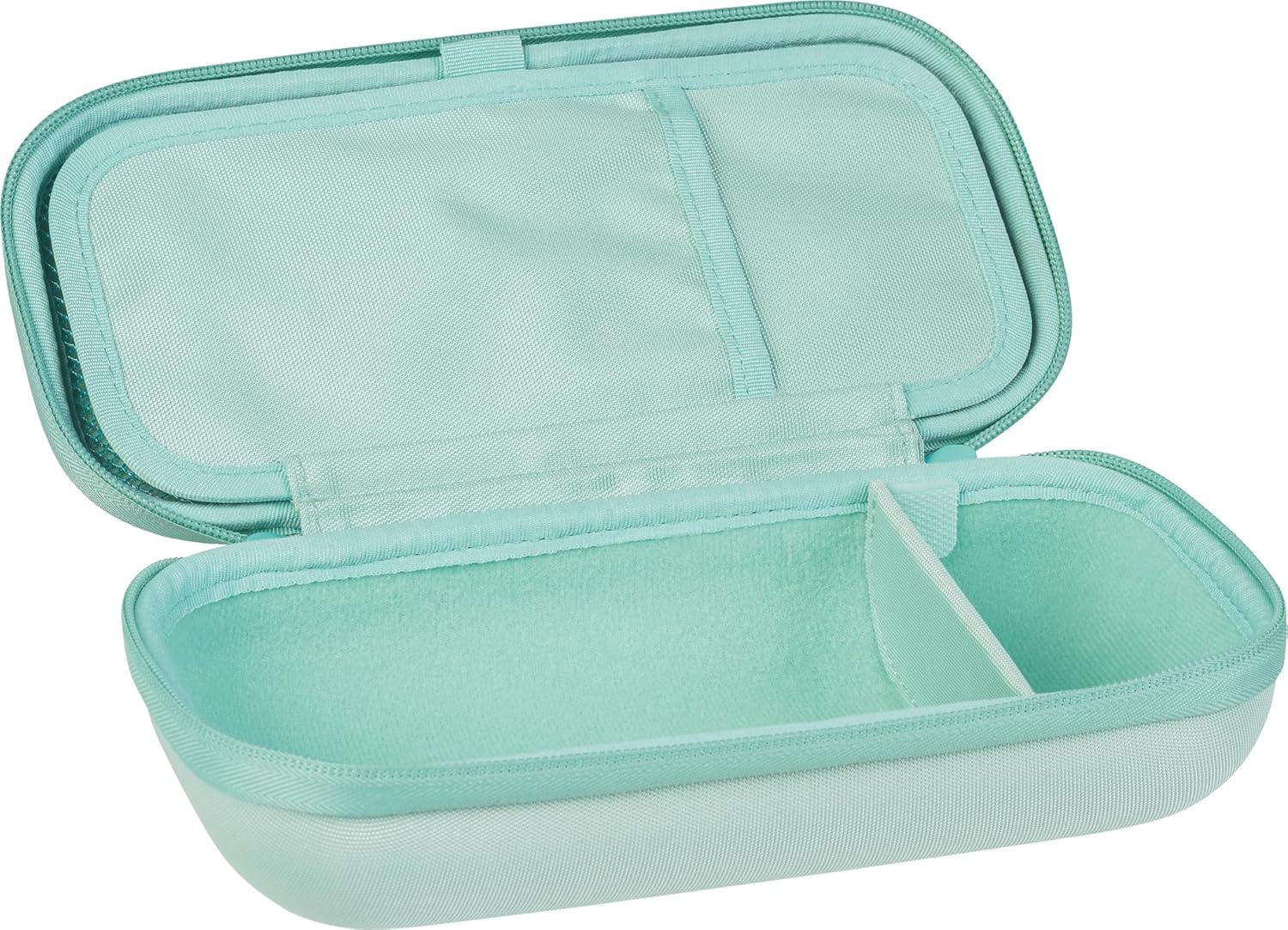 Astfel, fiecare obiect își are locul bine definit, maximizând eficiența și confortul în utilizarea zilnică, completând designul modern mint al penarului.