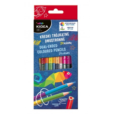 Creioane 2 în 1: un creion - două culori! Un set de douăsprezece creioane în 24 de culori intense. Datorită acestei soluții, putem economisi spațiu în cutia de creion și ne putem bucura de o gamă largă de culori. Forma ergonomică, triunghiulară a creioanelor facilitează o prindere corectă și o utilizare confortabilă. Creioanele au un stylus moale, au o acoperire excelentă, iar culorile pot fi amestecate liber.