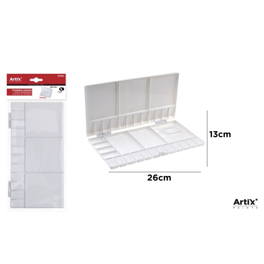 Paleta pop-up din plastic alb. Contine mai multe spatii pentru depunerea vopselelor si mai multe zone pentru diferite amestecuri de culori. Include o gaură pentru degetul mare, permițându-i să fie ținut cu o singură mână. Capacul va ajuta la menținerea vopselelor umede prin închiderea acestuia și permițându-le să reziste mai mult fără să se usuce. Dimensiuni: 26 x 13 cm.