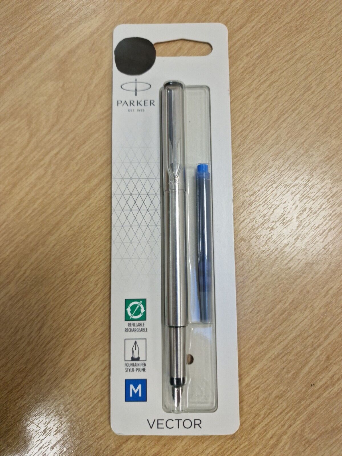 Etichete: stilou, clip, Capac, Oțel inoxidabil, Grip, convertor Parker, ABS, Vector Steel, placat cu crom, pastila din iridiu, F (fine), lungime 155 mm, latime 10 mm, greutate 14.6 g, Parker, penita, patroane cerneala