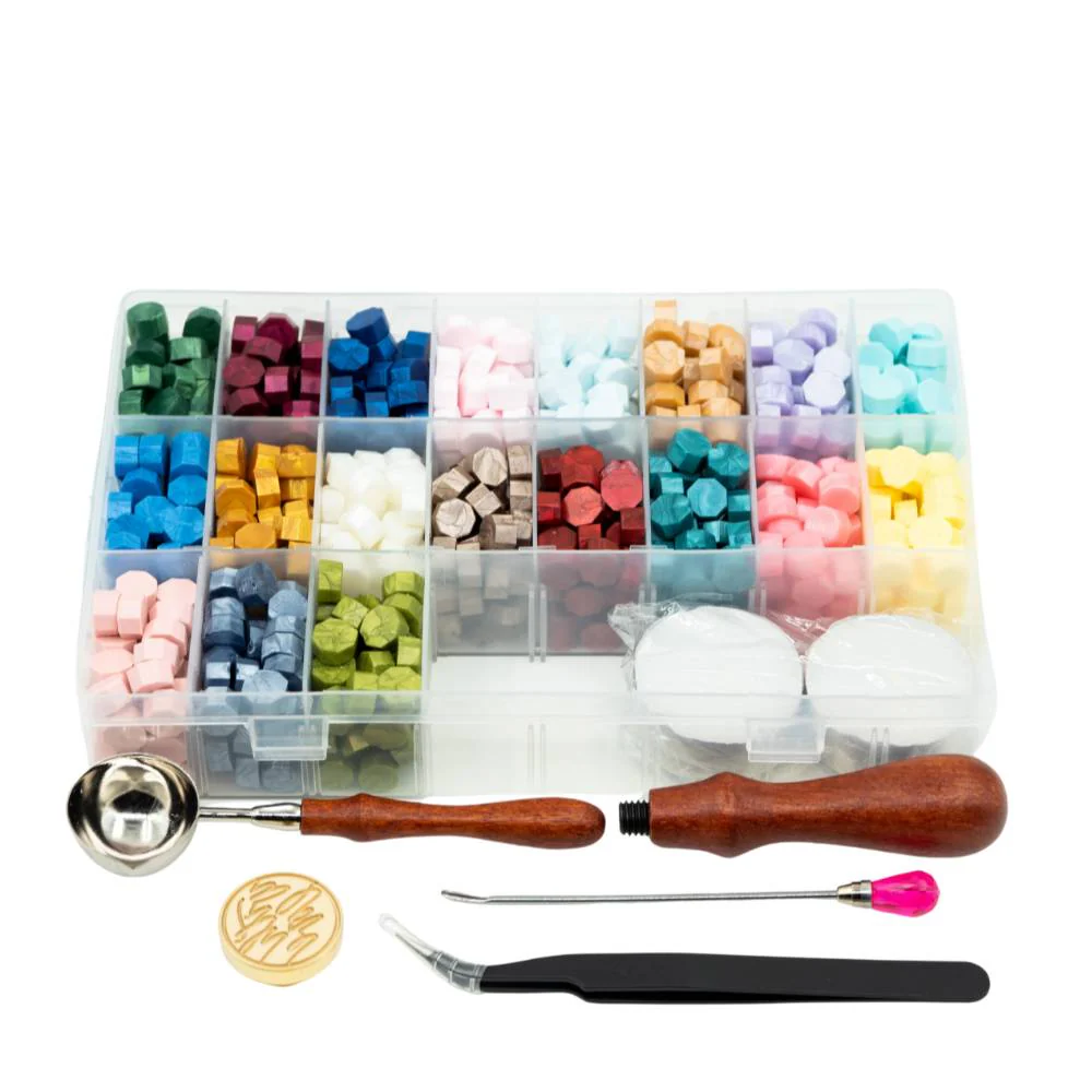 KIT COMPLET PENTRU SIGILII DE CEARĂ – 19 CULORI, ȘTAMPILĂ ALAMĂ & ACCESORII