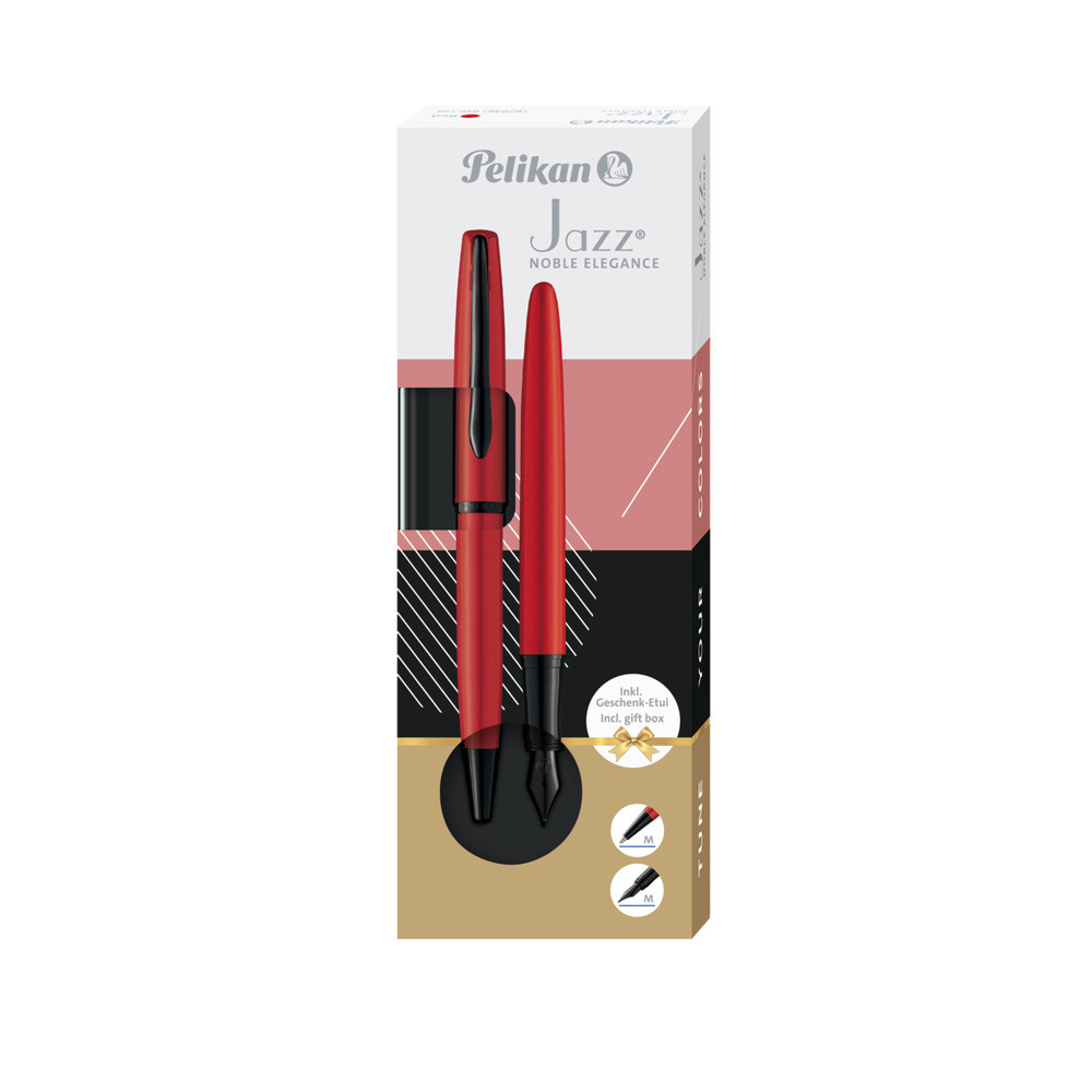 Setul cadou Pelikan Jazz Noble Elegance Red (cod 826778) conține un pix cu mecanism twist și un stilou cu alimentare prin patron de cerneală albastră inclus, ambele cu corp din metal lăcuit în nuanța Noble Red mat și accesorii cromate, prezentate într-o cutie cadou premium. Pixul funcționează prin mecanismul de răsucire twist care extinde și retractează mina fără buton de click, specific tradiției Pelikan pentru această gamă. Stiloul este echipat cu peniță din oțel inoxidabil de înaltă calitate și sistem de alimentare prin patron standard Pelikan, cu un patron de cerneală albastră inclus în pachet pentru utilizare imediată. Ambele instrumente prezintă clipul iconic în formă de cioc de pelican, emblema autenticității brandului german cu tradiție de peste 180 de ani. Setul este disponibil pe ipb.ro.