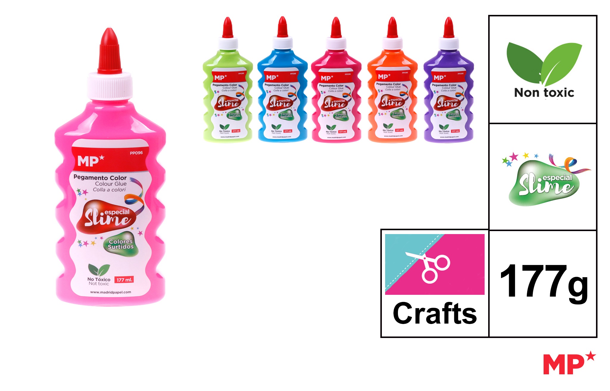 Adeziv colorat opac, special pentru realizarea de slime viu colorat, precum și pentru crafturi și decor. Ideal pentru uz școlar. Cu duză de dozare. Nu este toxic. 6 culori asortate: roz, violet, portocaliu, rosu, verde si albastru. Flacon de 177 ml.