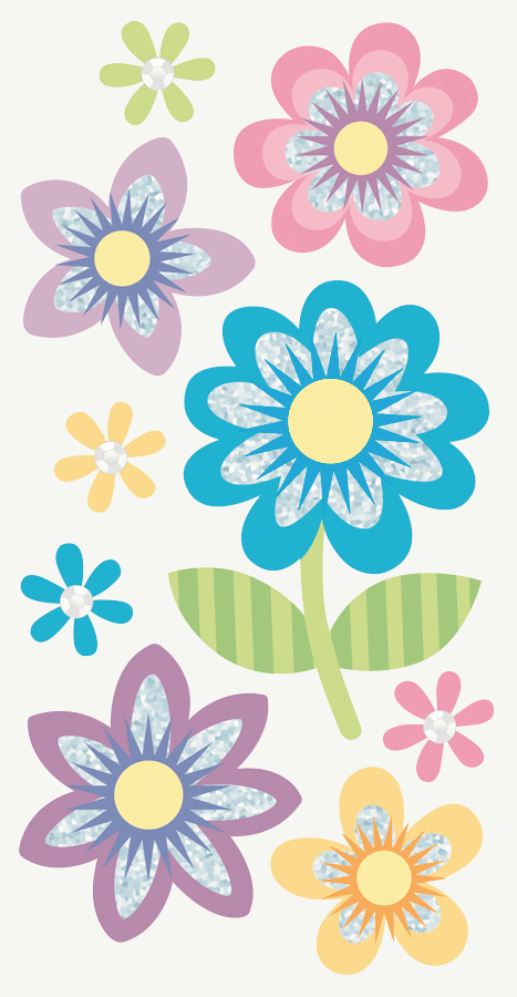 🅰️ Set de 9 autocolante decorative pe o singură coală de 75×165 mm, reprezentând flori în culori variegate, cu finisaje speciale precum folie caldă, pietre acrilice și ornamente decorative pentru un efect vibrant și sofisticat