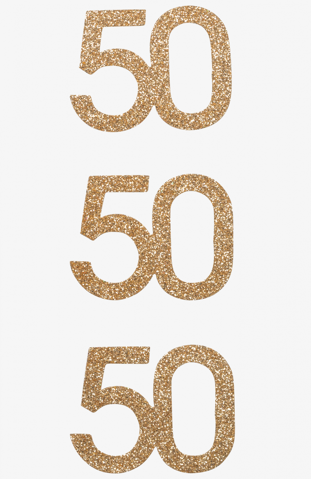 🅰️ Set de 3 autocolante decorative pe o singură coală de 75×165 mm, din carton de culoare auriu cu efect de glitter, reprezentând numărul 50 cu un finisaj luxos, completate cu detalii precum folie caldă, pietre acrilice și ornamente pentru un impact vizual impresionant