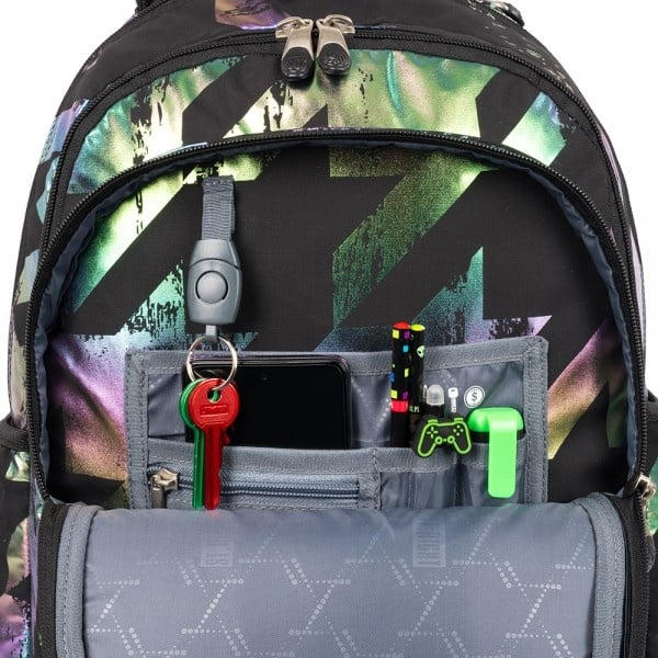 4. Compartimentul din fata, include organizator complex pentru telefon, breloc chei si spatii integrate pentru instrumentele de scris + un mic buzunar tip plasa cu fermoar.