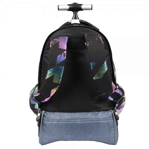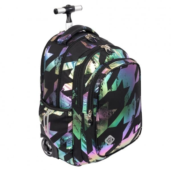 Ghiozdanul St.Right tip Troler, are 4 compartimente, maner telescopic reglabil pe 2 nivele si roti din silicon.
