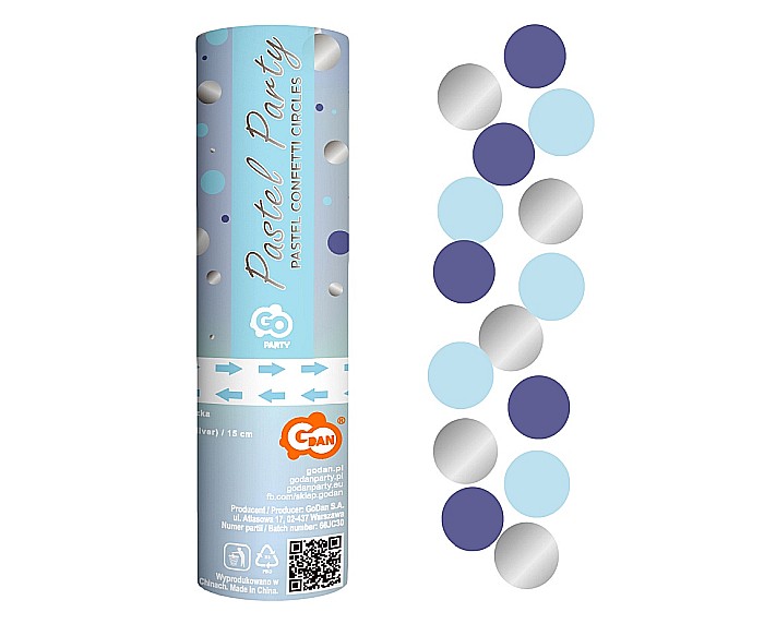 CONFETTI CONFETTI CANNON CIRCLES, BLUE-DARK BLUE-SILVER, 15CM JC-KPKN15